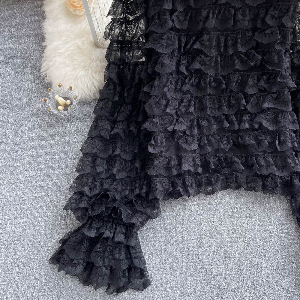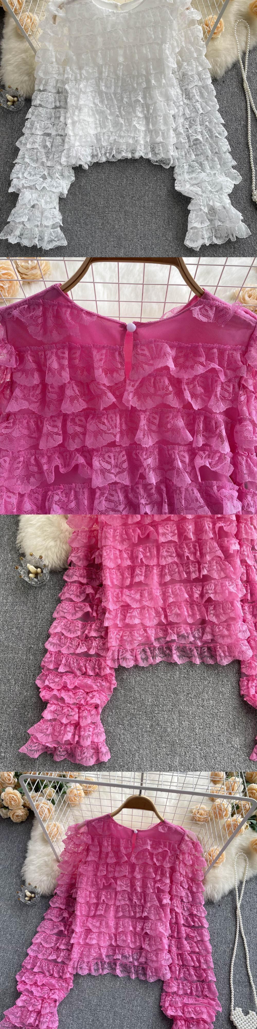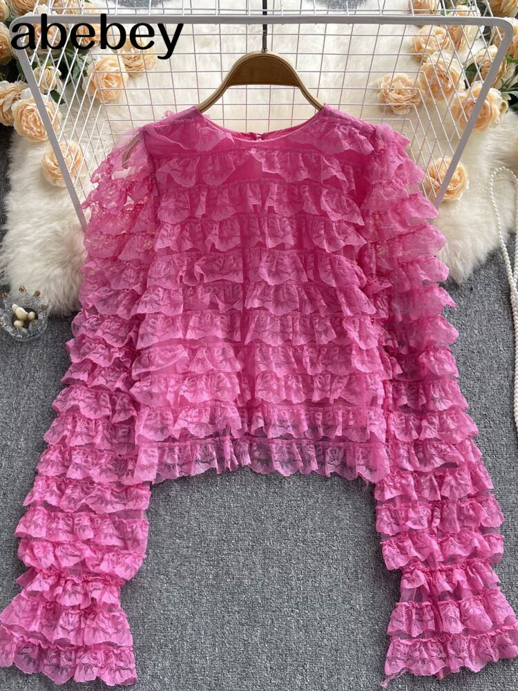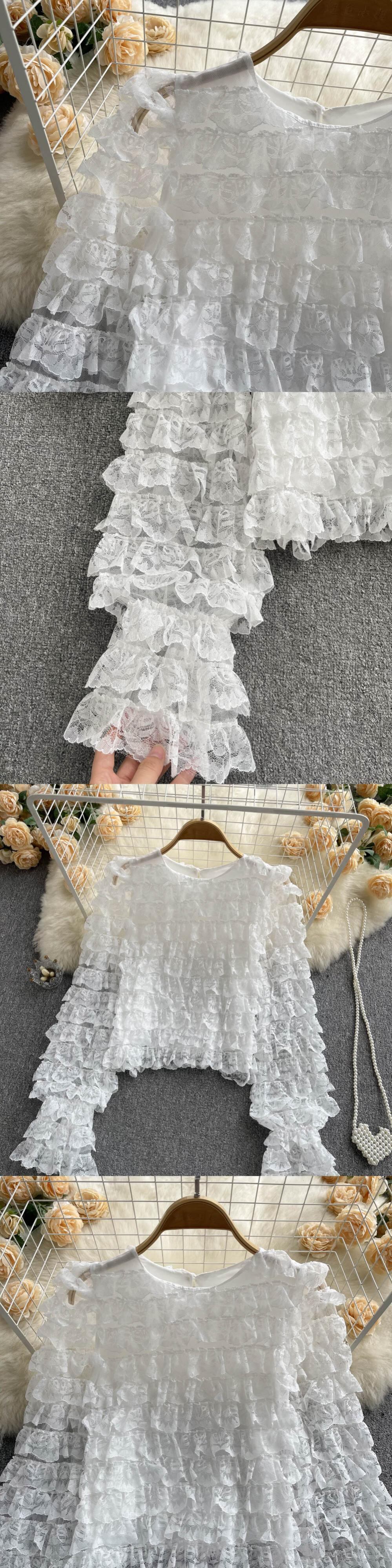 秋の休暇スタイルフリルレースワークシャツ O ネック長袖ブラウス 2022 ルーズ女性シフォントップス ロング オータム 秋物 Oネック Abe49082014097