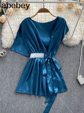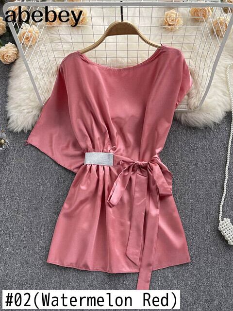 ピンク/ブルー/レッドサテン不規則なレディーストップスとブラウス O ネックトップチュニック 2022 夏の女性のシャツ サマー 夏物 Oネック Abe1568660289