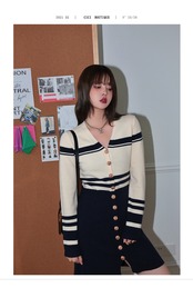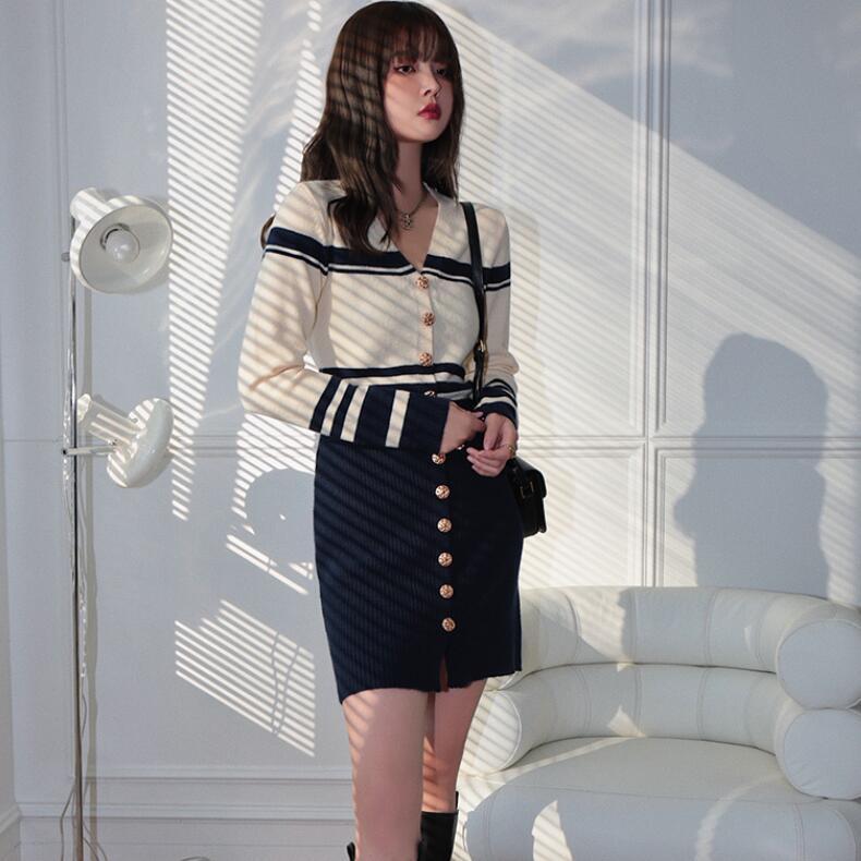 フランス 2022 秋の高級女性パッチワークシングルブレストストライプ長袖ニットスリムドレス ロング オータム 秋物 Rhc46768684910