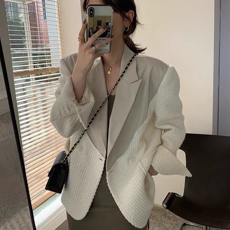 2022 秋冬の女性のスーツのジャケット白パッチワークイングランドスタイルのブレザーコート長袖生き抜くポケット ロング ホワイト オータム 秋物 ウィンター 冬物 ヨーロピアン Rhc65977863303