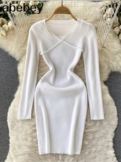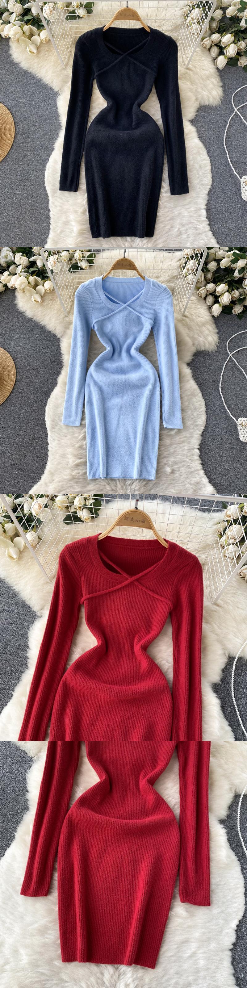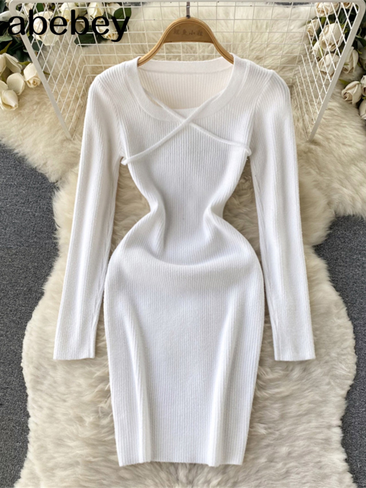 女性ニットペンシルドレス長袖 O ネック弾性スリムドレス秋冬セクシーなボディコン暖かいセータードレス ロング エラスティック 伸縮 オータム 秋物 ウィンター 冬物 Oネック Abe75780324745