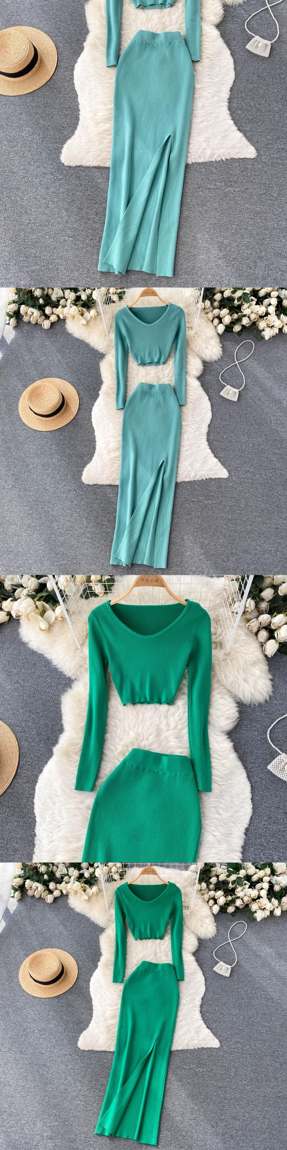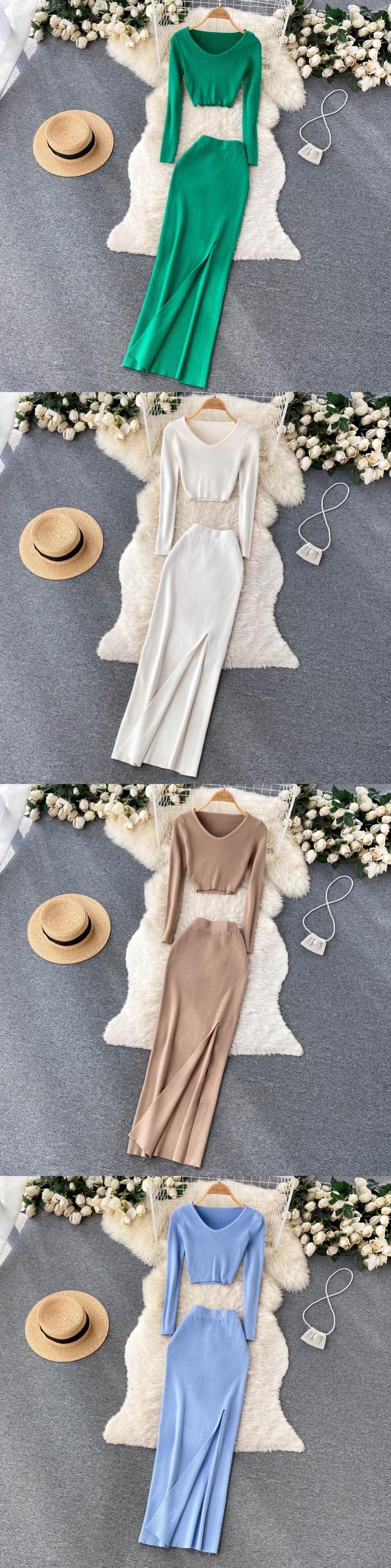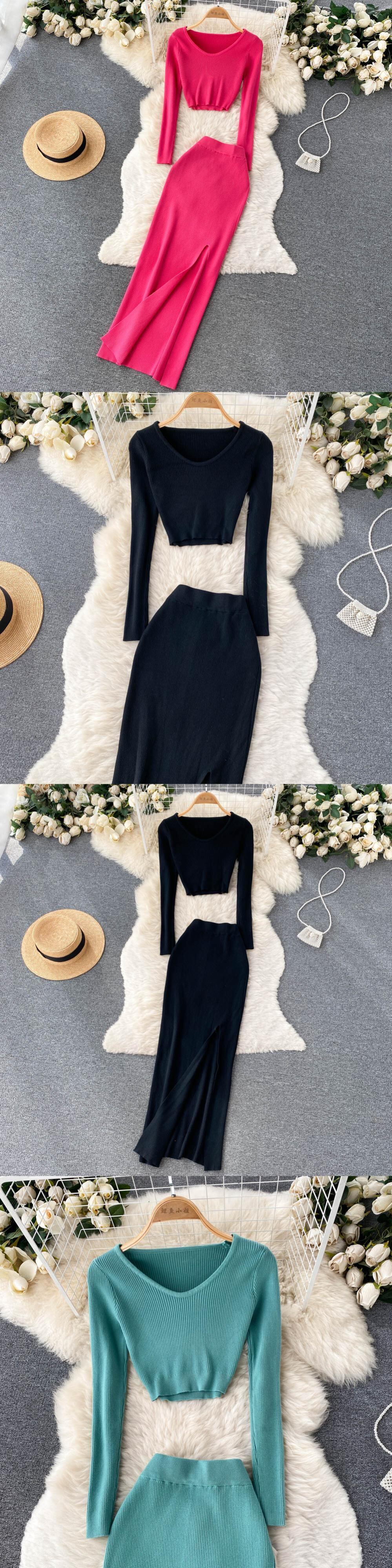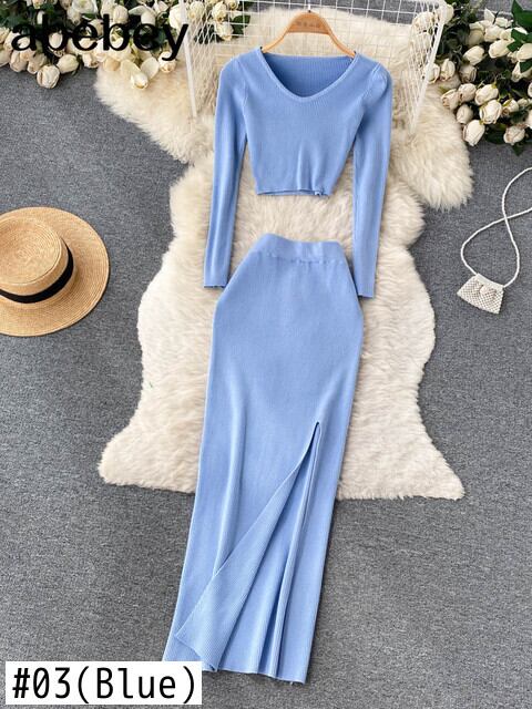 スプリット秋二枚スーツ V ネックミニトップ + t ウエストスリムロングドレス女性ストリートソリッドニットセット オータム 秋物 Vネック ソリッドカラー Abe1064551617