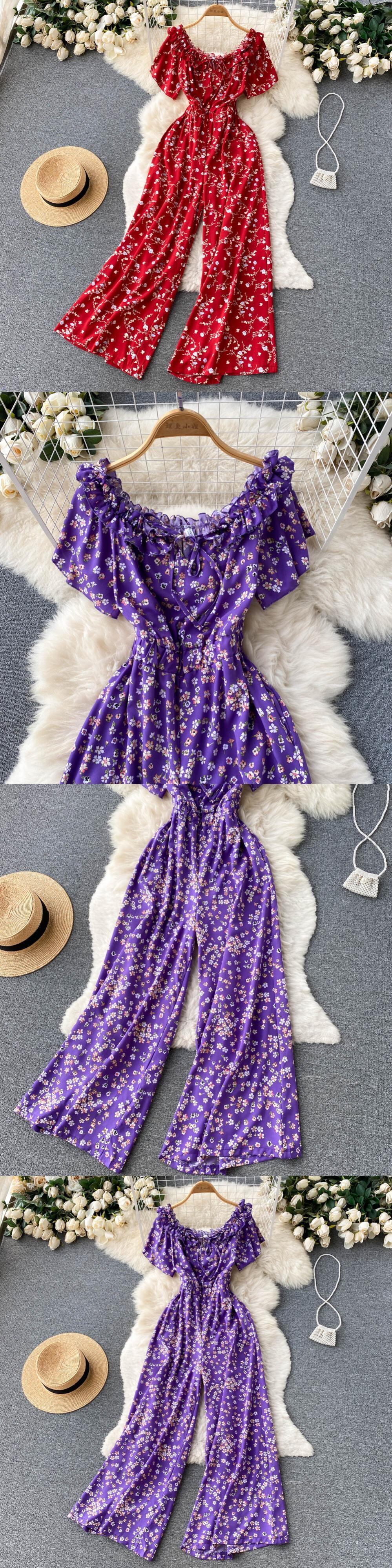 女性シフォン夏プリントジャンプスーツ花フリル甘いワイドレッグロングパンツLadie Boheビーチロングジャンプスーツ ラッフル 大人ガーリー スウィート キュート カジュアル サマー 夏物 花柄 ワイドパンツ Abe65212168410