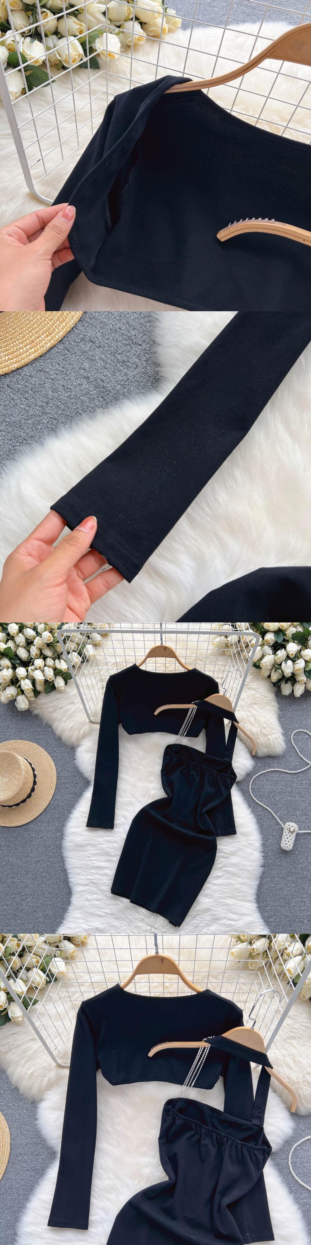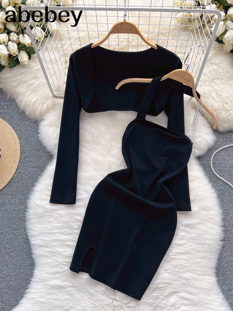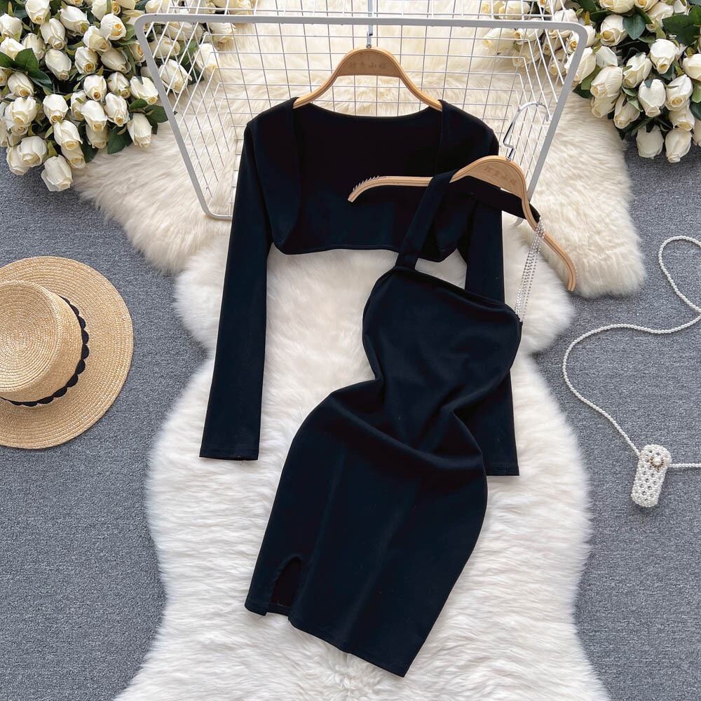 女性 2 点セット長袖コート トップ + ボディコン スリム ウエスト シャーリング スパゲッティ ストラップ ドレス ロング Abe87666551612