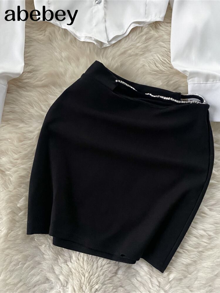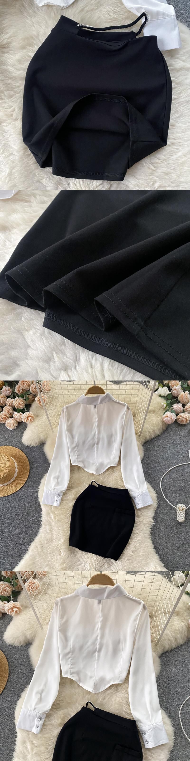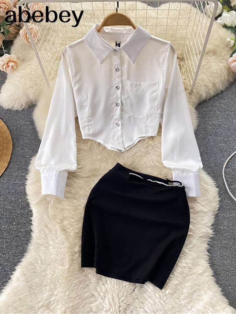 2022 OL ホットセクシーな白シャツブラウストップス女性 + 黒のミニボディコンスカートツーピーススーツトップセット ホワイト ブラック Abe14671715993