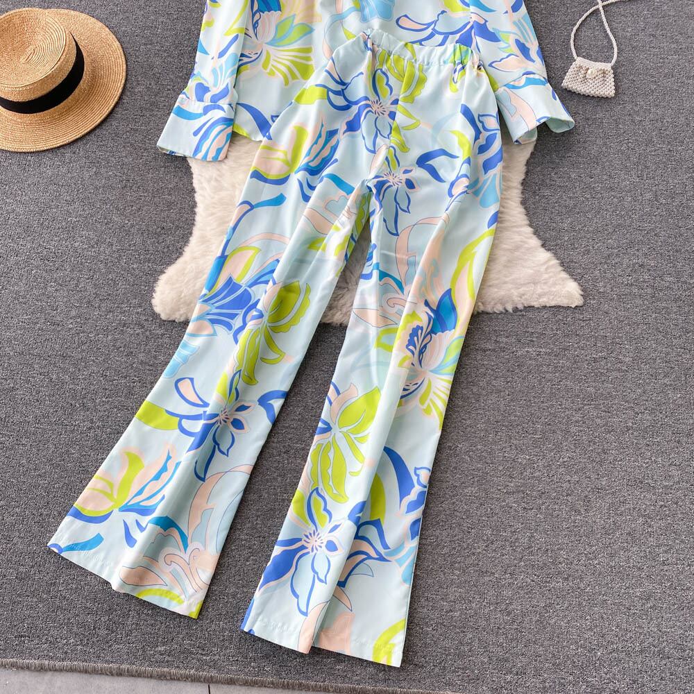 花柄ツーピース スーツ ボタン長袖シャツ トップ + ウエストゴムゆったり長ズボン女性 OL 秋セット ロング エラスティック 伸縮 オータム 秋物 Abe15313441741