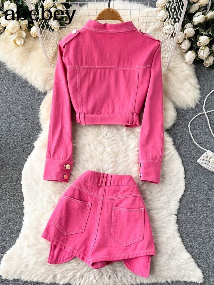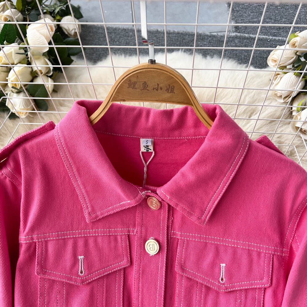 ピンクデニム無地レトロ女性セット夏 2022 シングルブレストターンダウンネックジッパーショーツ 2 点セット サマー 夏物 ブルマー ソリッドカラー Abe29673579340