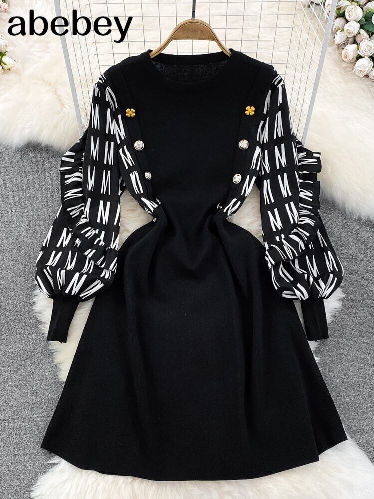 女性秋長袖プリントパッチワークミディドレス滑走路オフィスウエスト A ライン Vestidos ロング オータム 秋物 Aライン 会社 学校 通勤や通学にも Abe71647183389