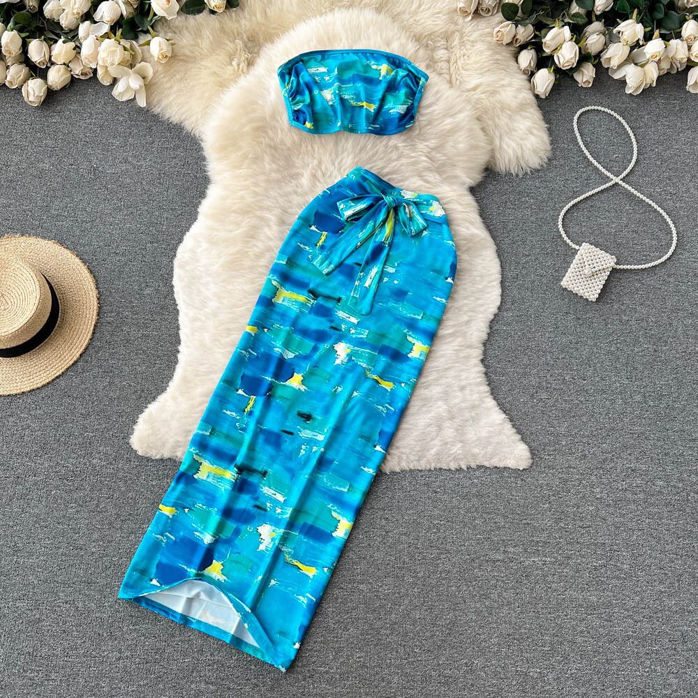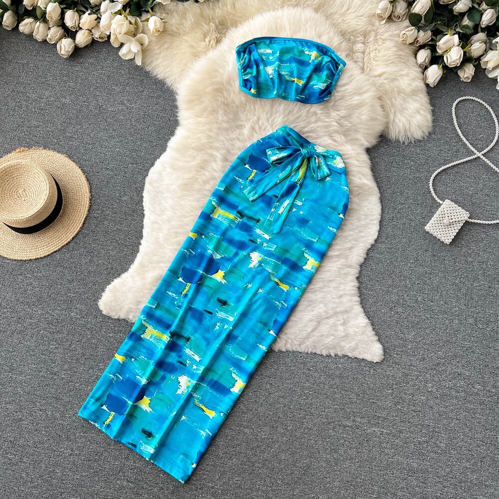 女性ストラップレスクロップタンクトップペンシルミディスカートツーピースセットスーツ衣装 2022 夏服ストリート サマー 夏物 Abe2680572716