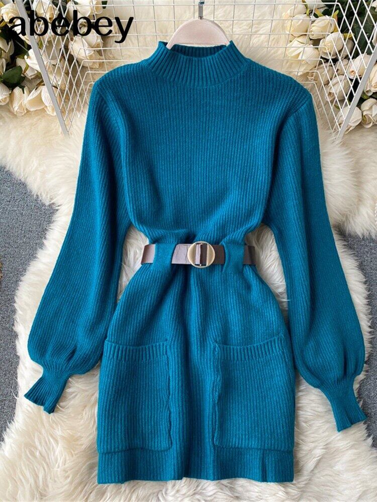 長袖秋冬ニット女性ベルト付きスリム長袖白セータードレス女性 Vestidos ドレス ロング ホワイト オータム 秋物 ウィンター 冬物 ハーネス Abe61656348883
