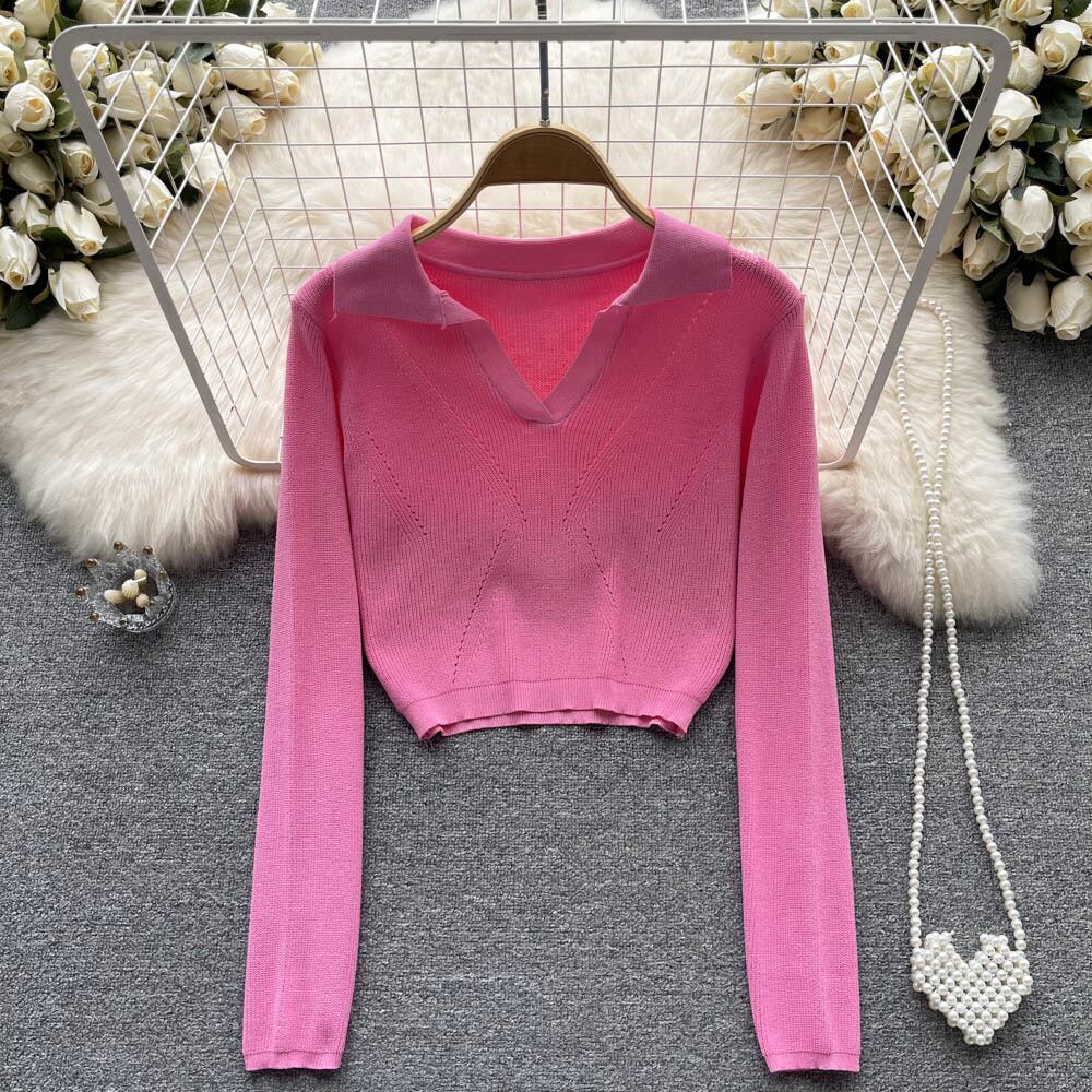 女性クロップドニットセーターラペルカラーロングスリーブプルオーバーシックなトップス 長袖 Abe9078237915