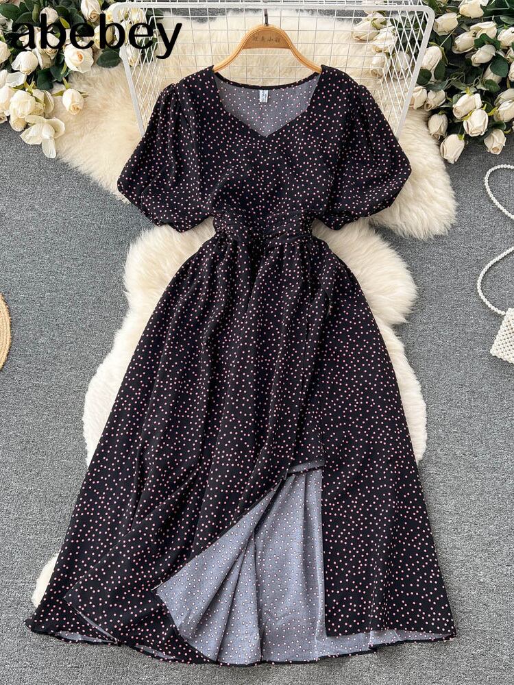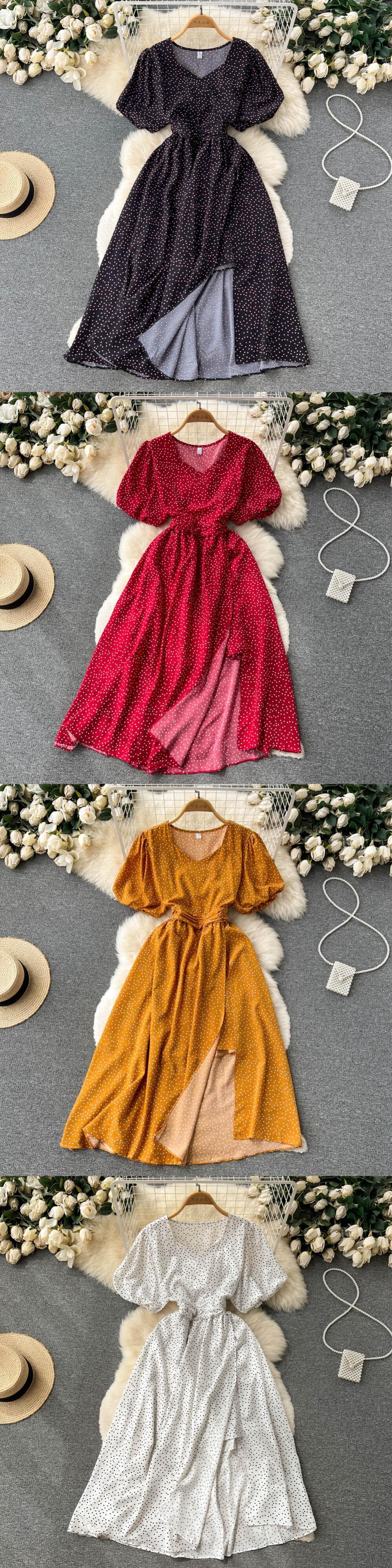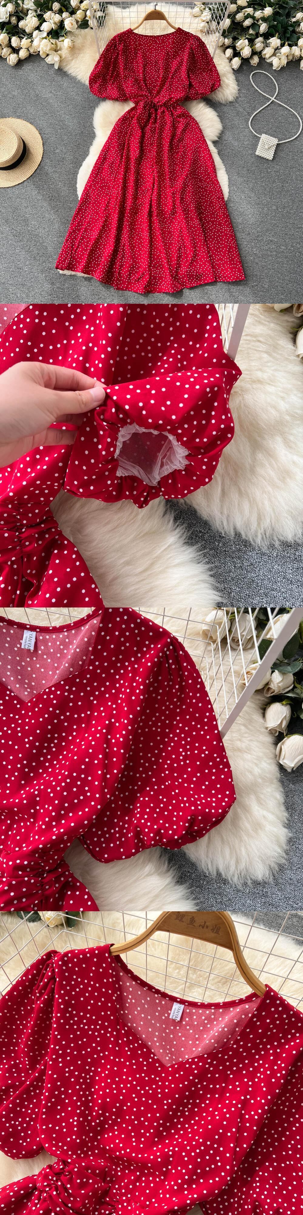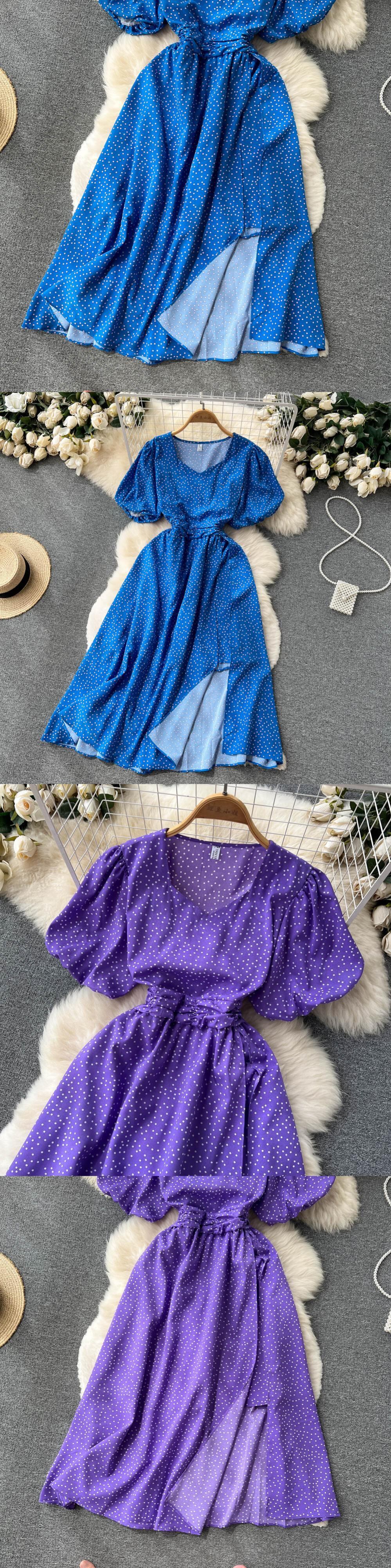 夏フレンチドットドレス女性甘いセクシーな V ネックスプリット A ラインドレス自由奔放に生きるプリント休暇ビーチサンドレス 大人ガーリー スウィート キュート カジュアル サマー 夏物 Vネック Aライン Abe63608036233