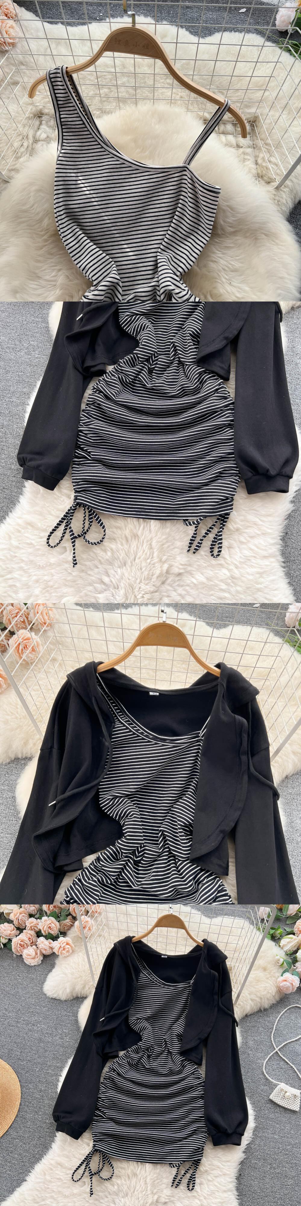 2022 女性二枚セットランタンスリーブブラウスシャツトップ + ボディコンスリムウエストシャーリングスパゲッティストラップドレス Abe39227418488