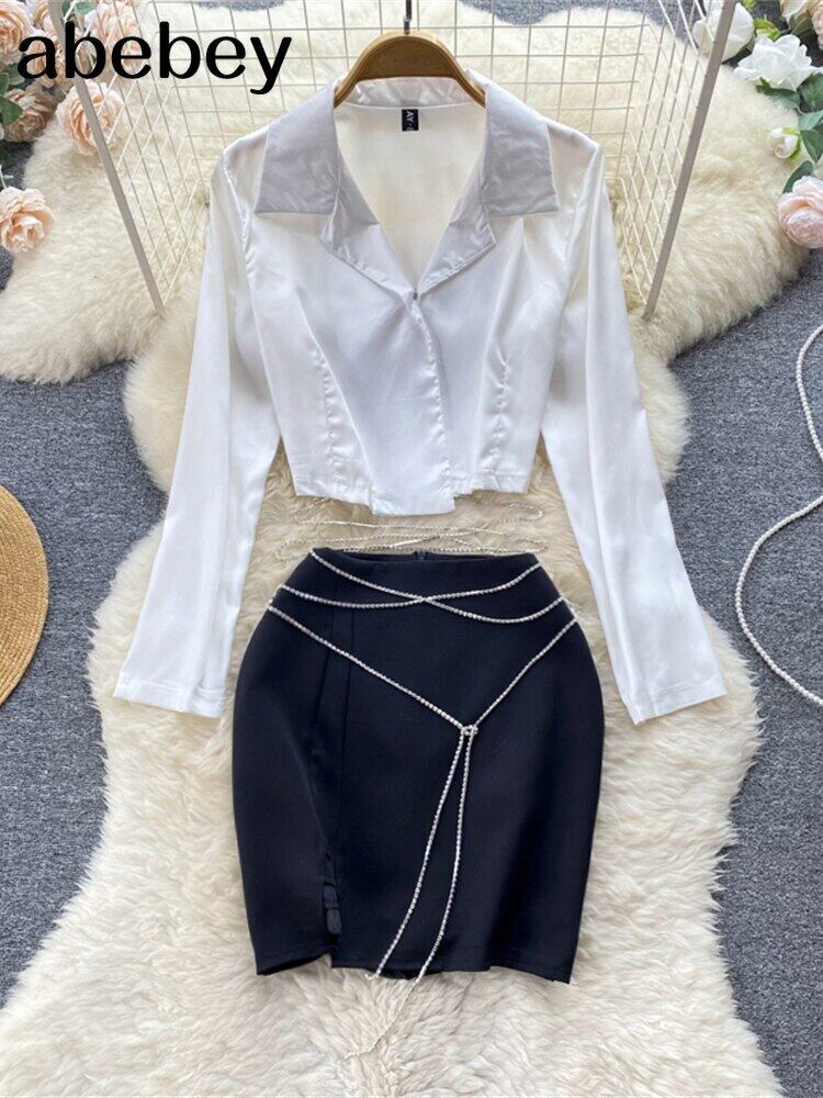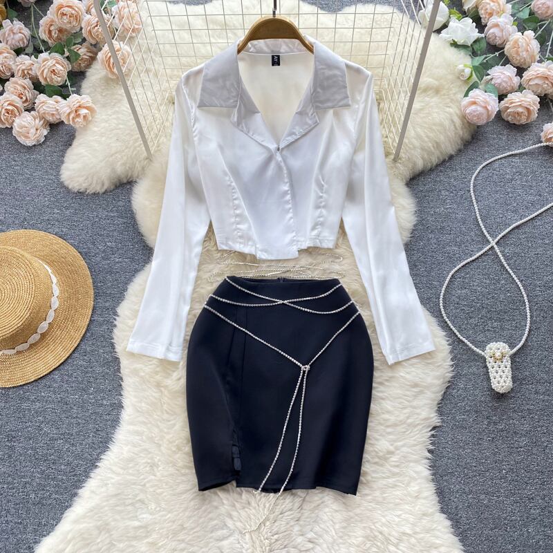 OLホットセクシーな白いシャツブラウストップス女性+黒のミニチェーンスカートツーピーススーツトップセット ホワイト ブラック Abe76368240430