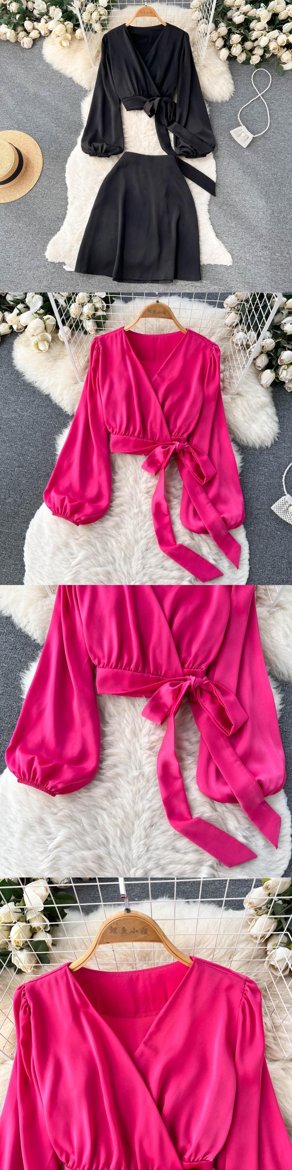 セクシーなスカートセット女性長袖ブラウストップスウエストミニスカートサテン二枚ノット弓バック ロング リボン Abe71443065128