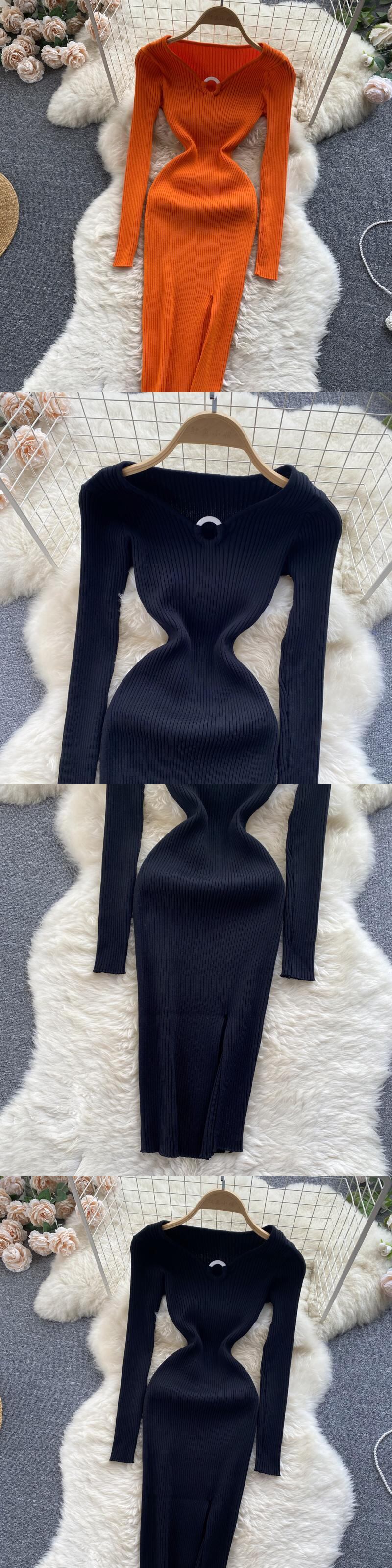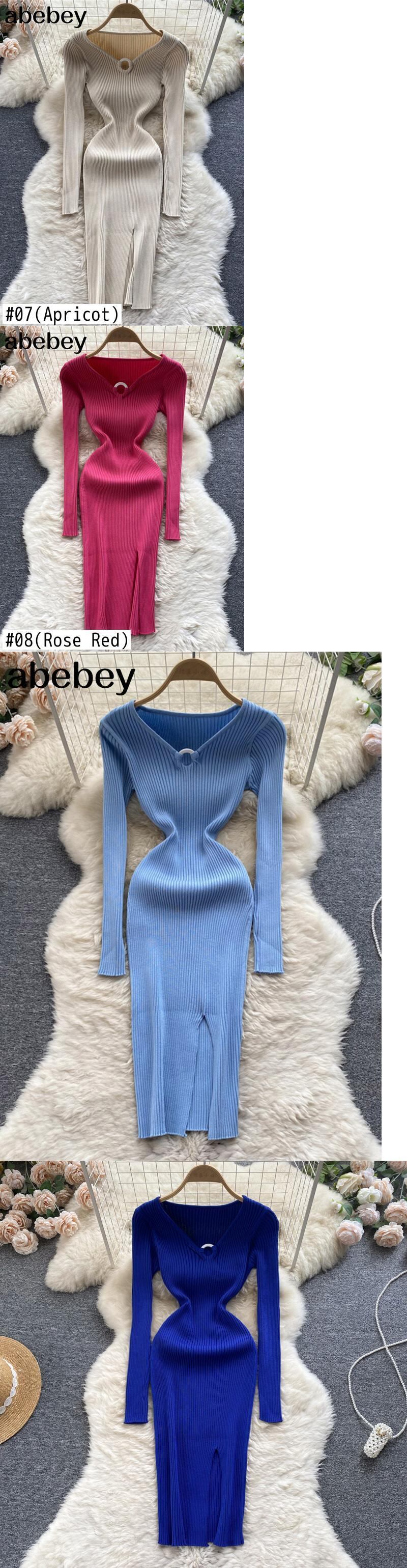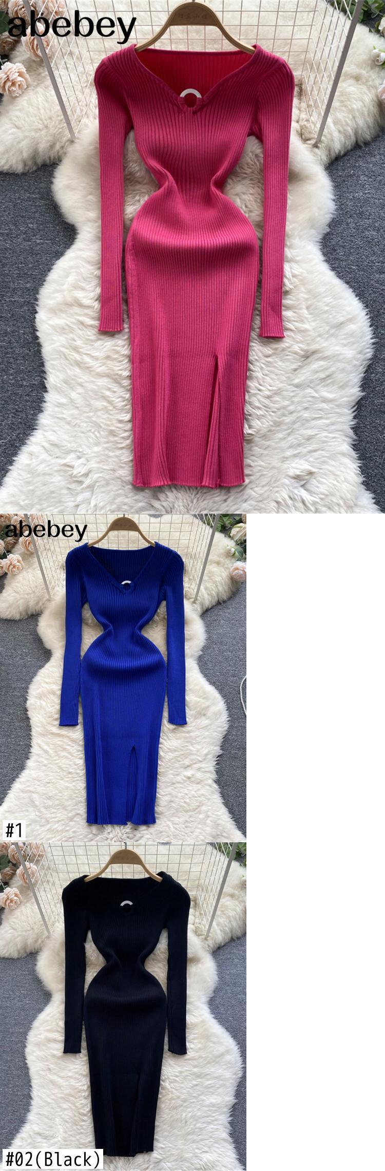 シニア女性ニットドレス長袖 V ネック弾性スリムペンシルドレス 2022 秋のセクシーなボディコンスプリットセータードレス ロング エラスティック 伸縮 オータム 秋物 Vネック Abe14223605361