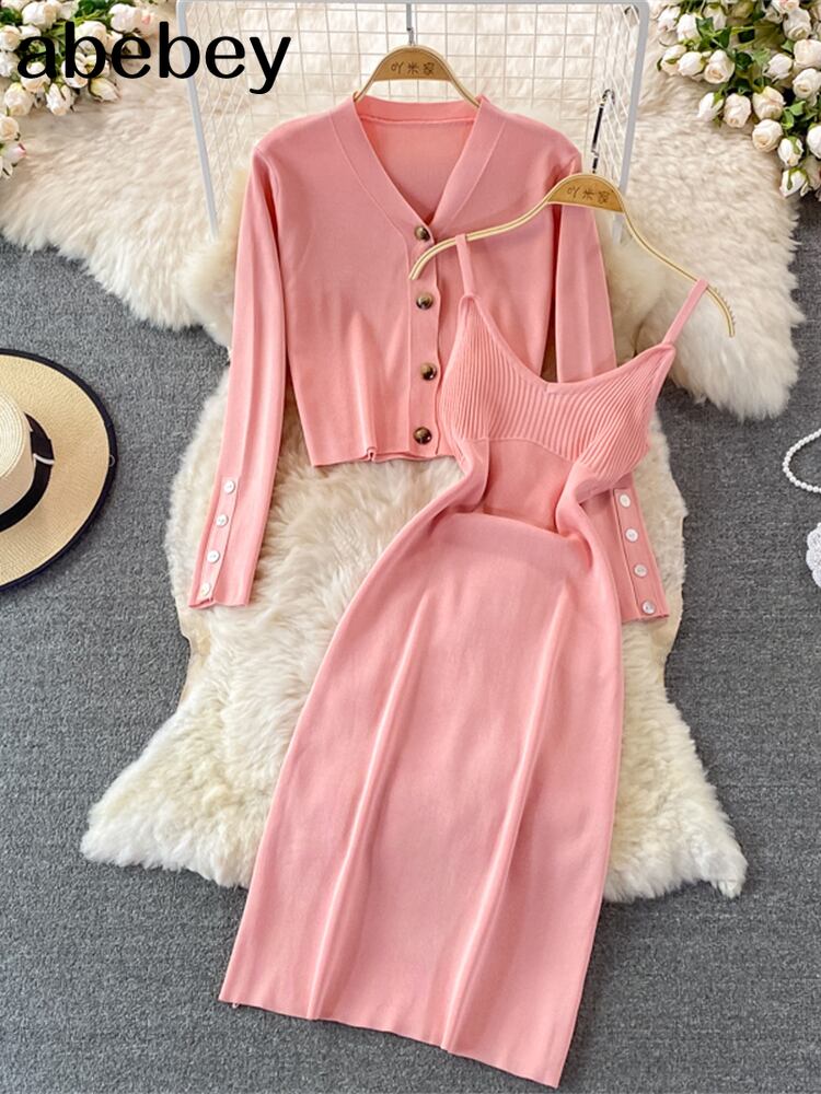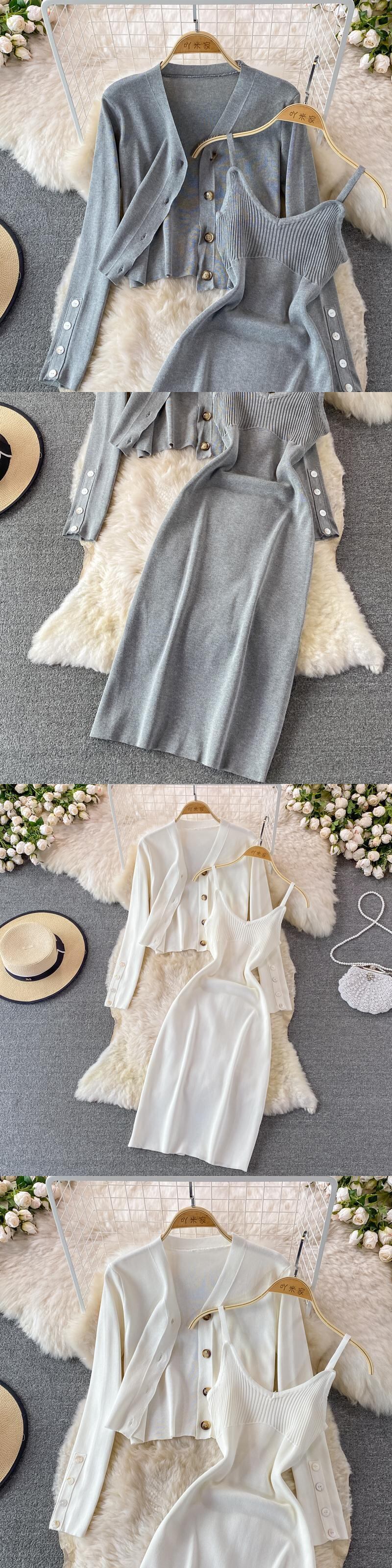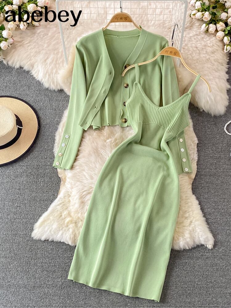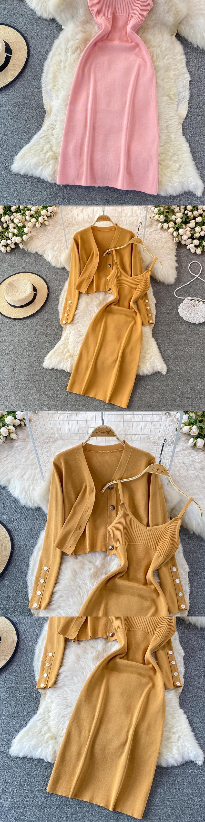 2022 ボタンニット女性セットルーズロングスリーブカーディガン + ソリッド弾性ドレスフレンチスタイルツーピースセット 長袖 エラスティック 伸縮 ソリッドカラー Abe30818554440