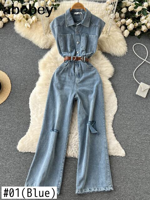 女性デニムジーンズサッシジャンプスーツポケットシングルブレストターンダウン襟ノースリーブ女性ジーンズ衣装 Abe47635879979