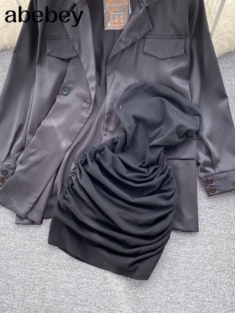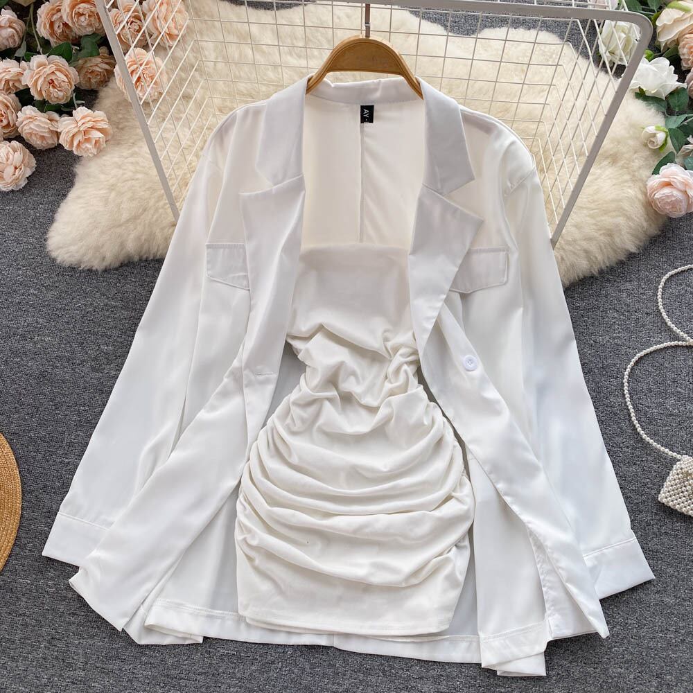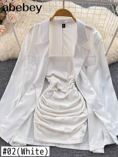 女性 2 点セット長袖ホワイト スーツ トップ + ボディコン スリム ウエストシャーリング スパゲッティ ストラップ ドレス ロング Abe934758953
