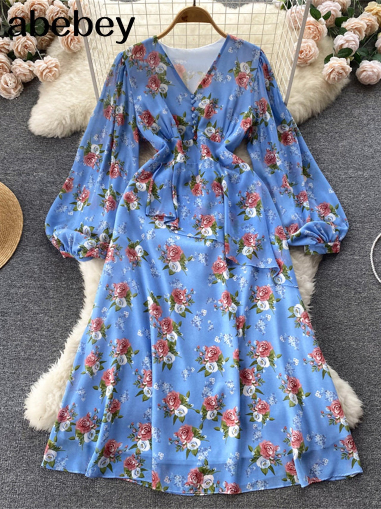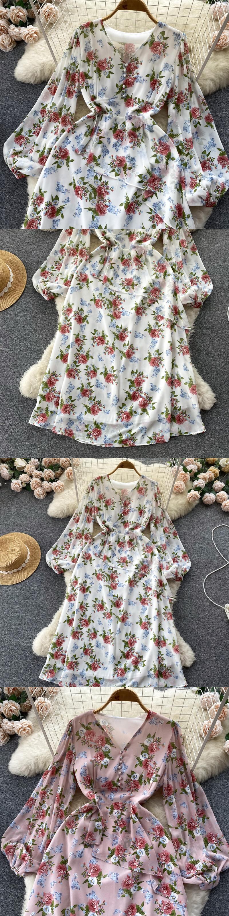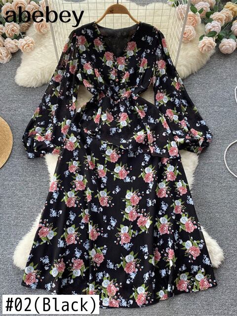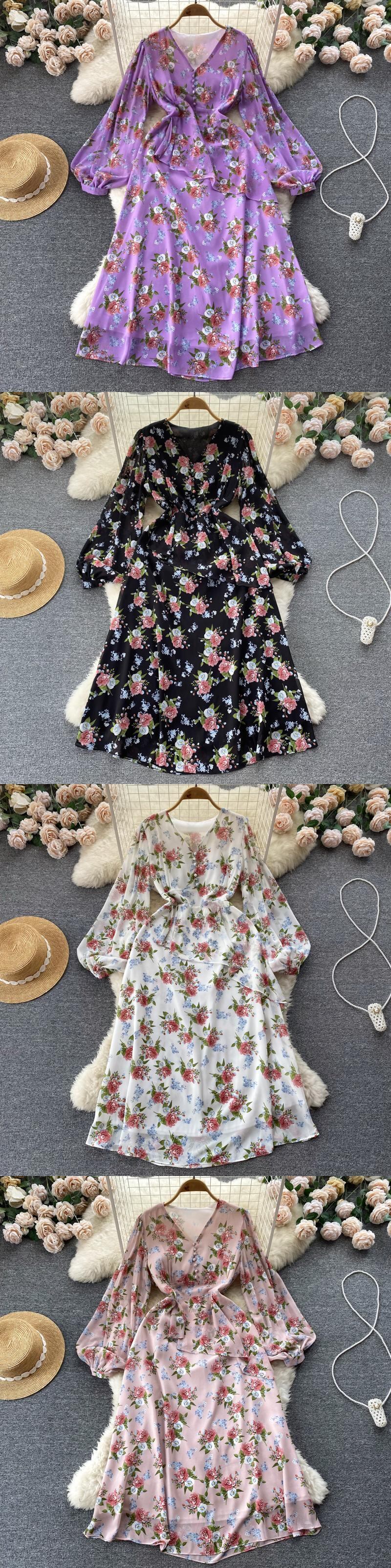 2022 女性の夏のロングドレス 2022 V ネックレトロサッシシフォン Floarl プリント休暇ビーチスリムドレス サマー 夏物 Vネック Abe29383046196