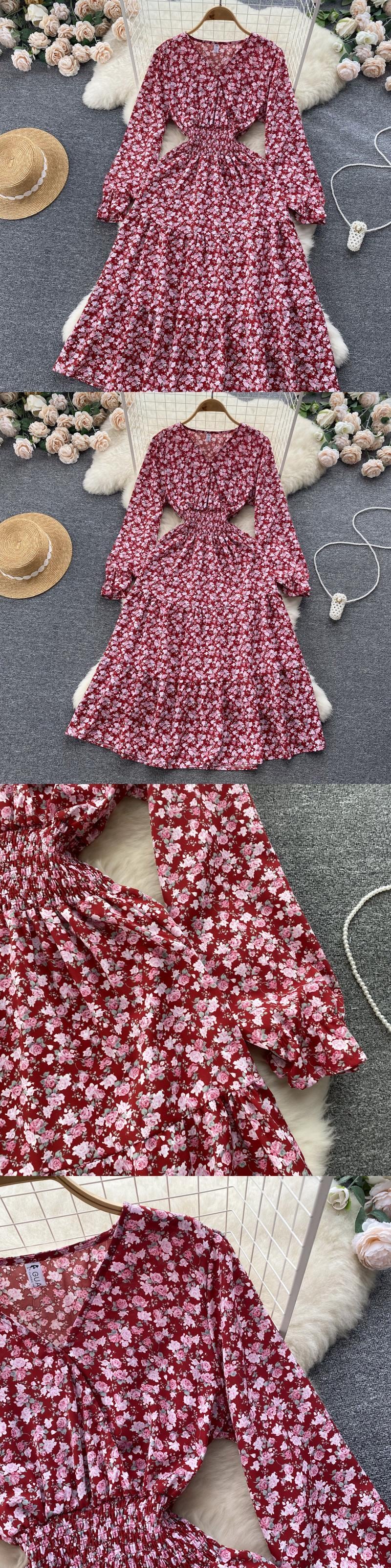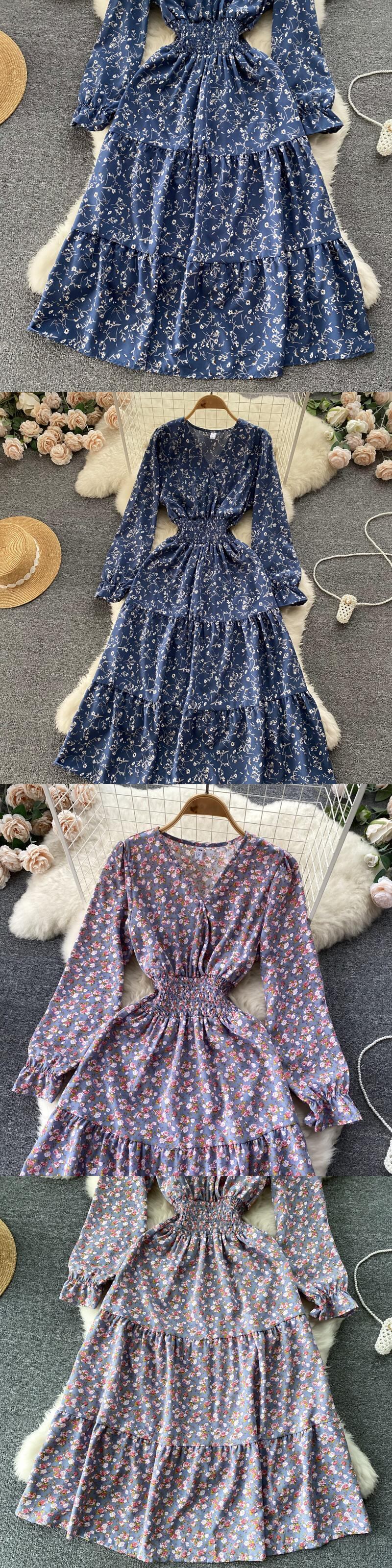 シニアシースプリントドレス気質ラフスリーブボタン秋弾性ウエストビーチ休暇花柄ロングドレス エラスティック 伸縮 オータム 秋物 Abe50887716436