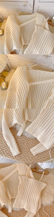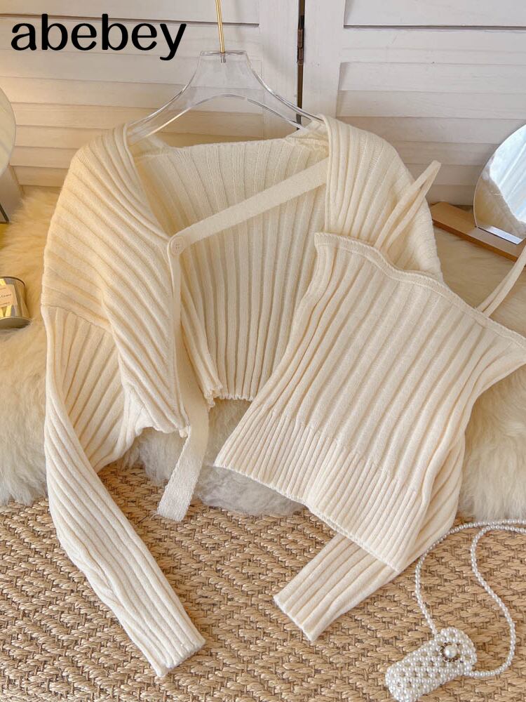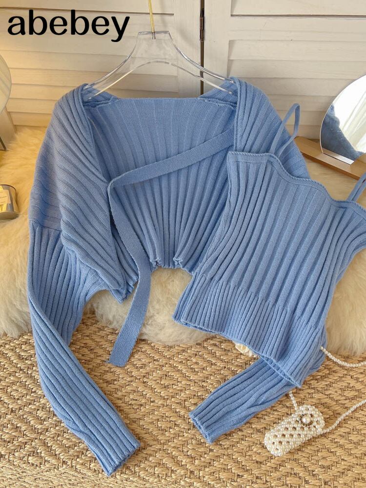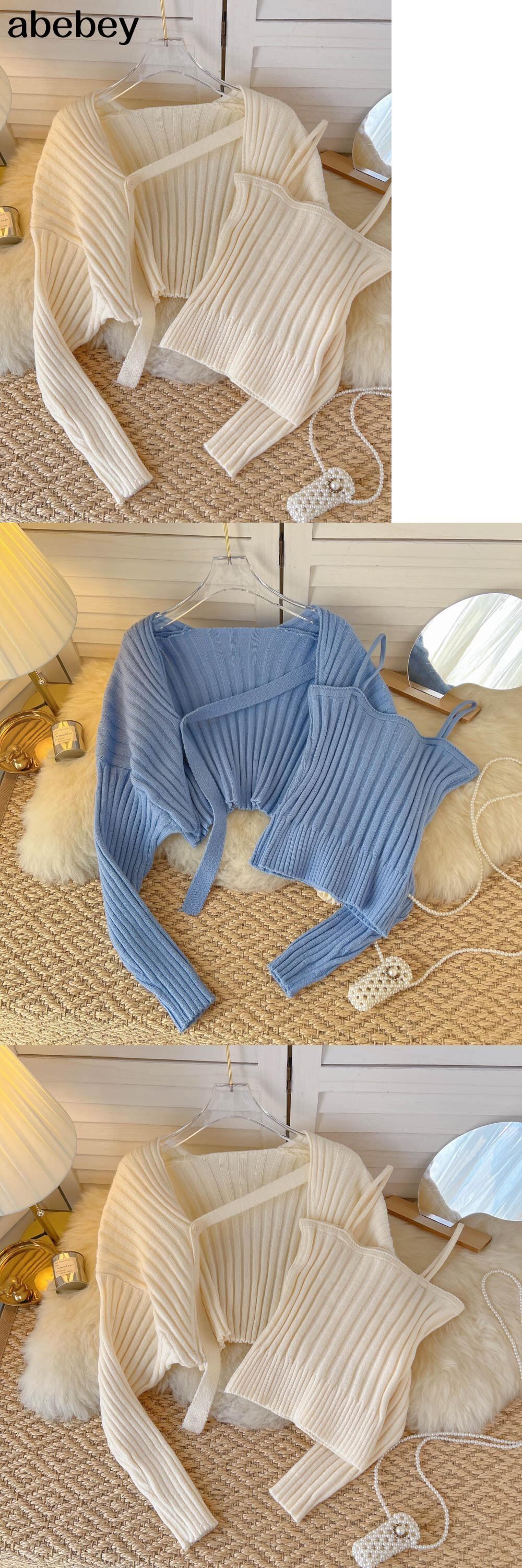 固体女性ツーピーススーツ秋 2022 ストラップキャミソール長袖オープンステッチトップス弾性ニットセット ロング エラスティック 伸縮 オータム 秋物 ソリッドカラー Abe61078285836