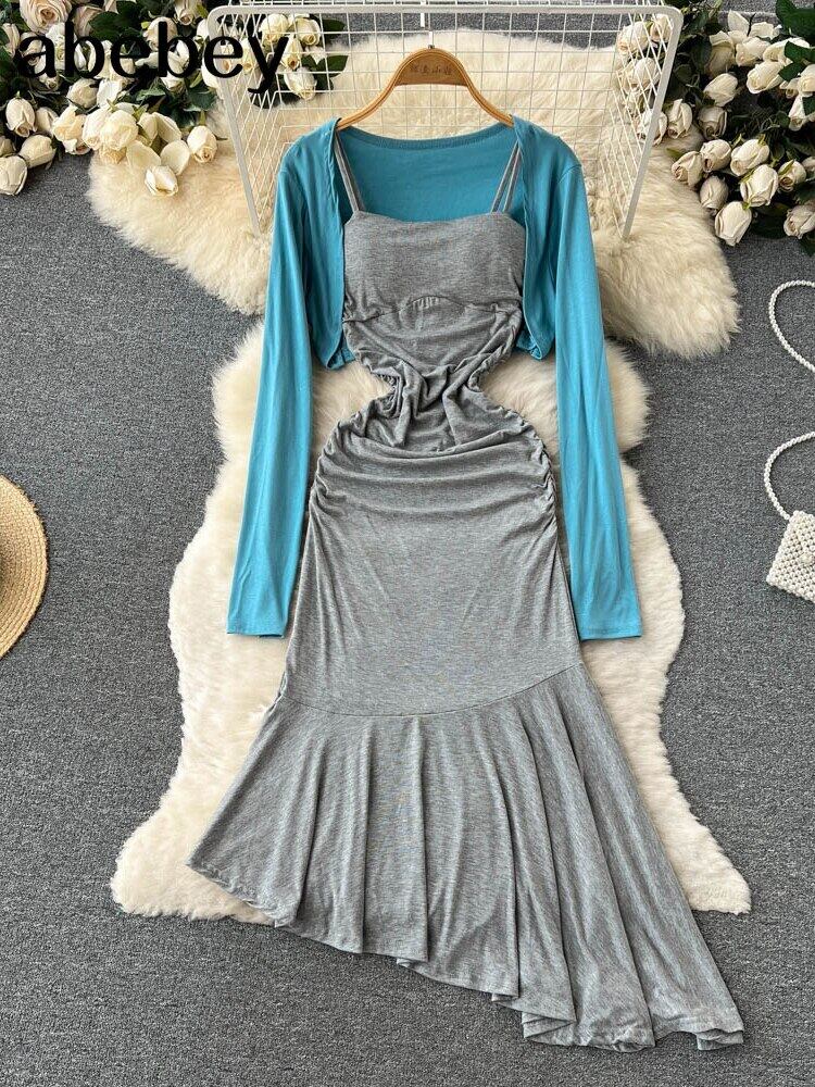 2022 夏秋ツーピースセット長袖無地オーバーコートスパゲッティストラップスリム黒無地ドレス ロング ブラック サマー 夏物 オータム 秋物 ソリッドカラー Abe26677051480