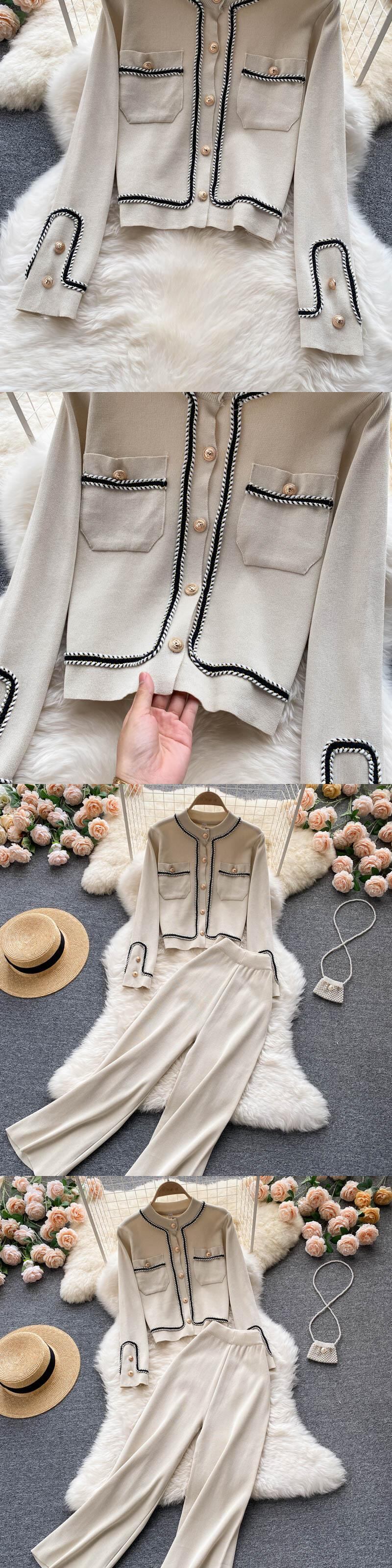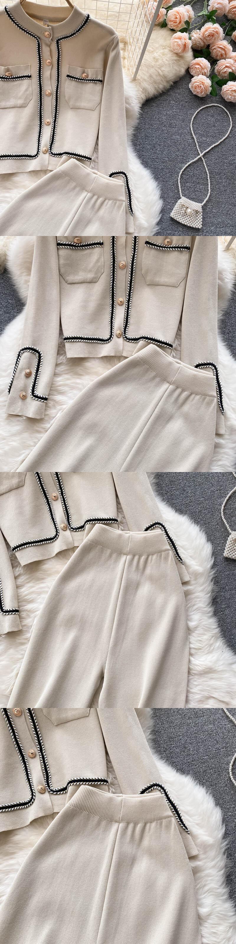 女性カーディガン セーター トラック スーツ リブ ニット ジャンパー スーツ + ワイドレッグ パンツ 2/2 ピース春セット スプリング 春物 ワイドパンツ Abe48360240340
