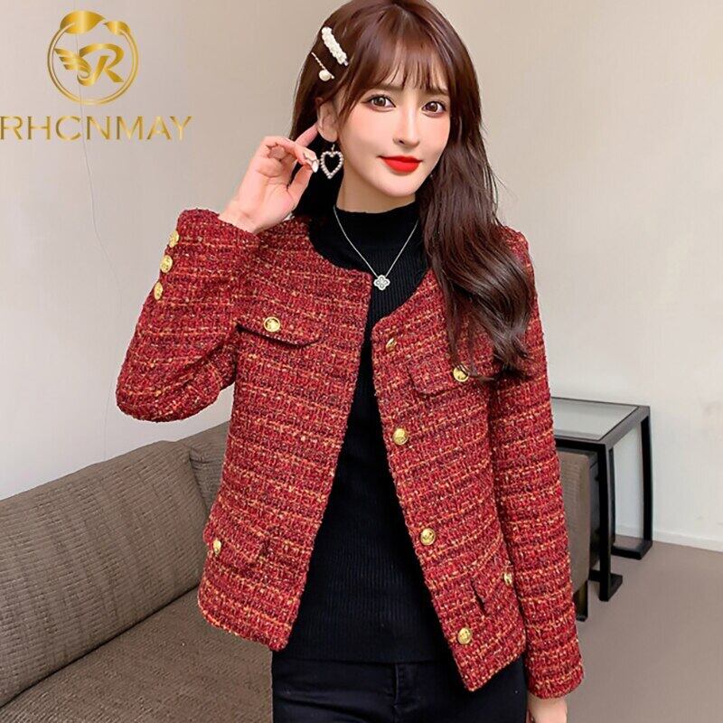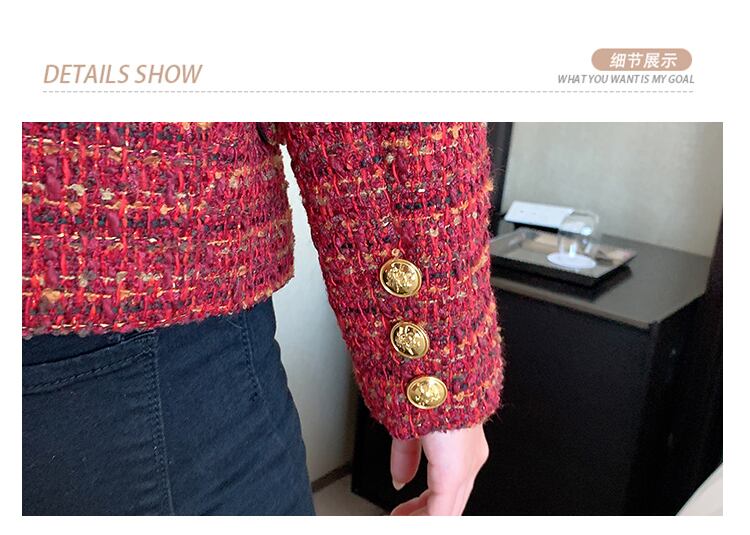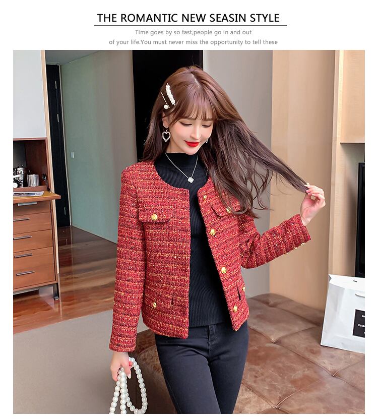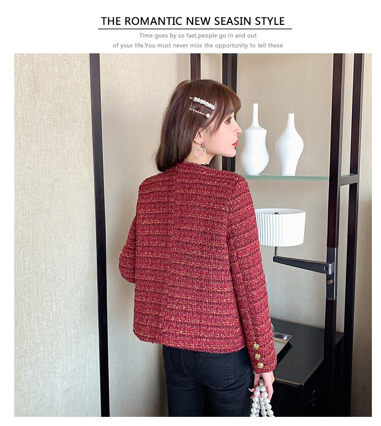 秋の小さな香りレッド ツイード ジャケット コート長袖ラウンド ネック シングル ブレスト オフィス レディ アウター ロング オータム 秋物 Oネック 会社 学校 通勤や通学にも Rhc92520345631