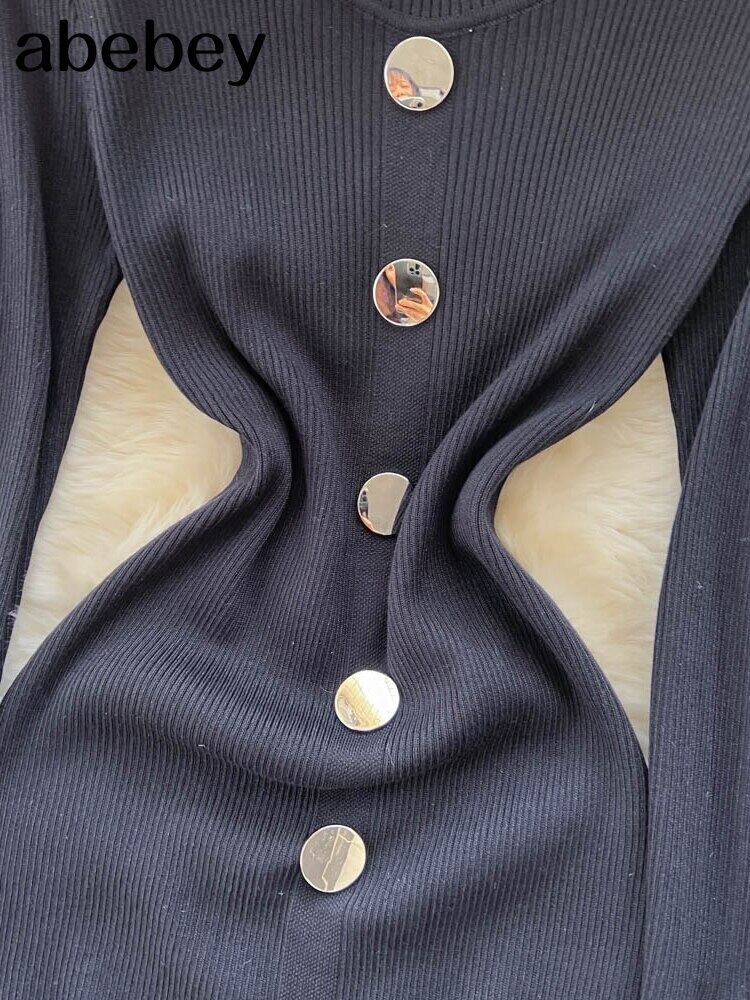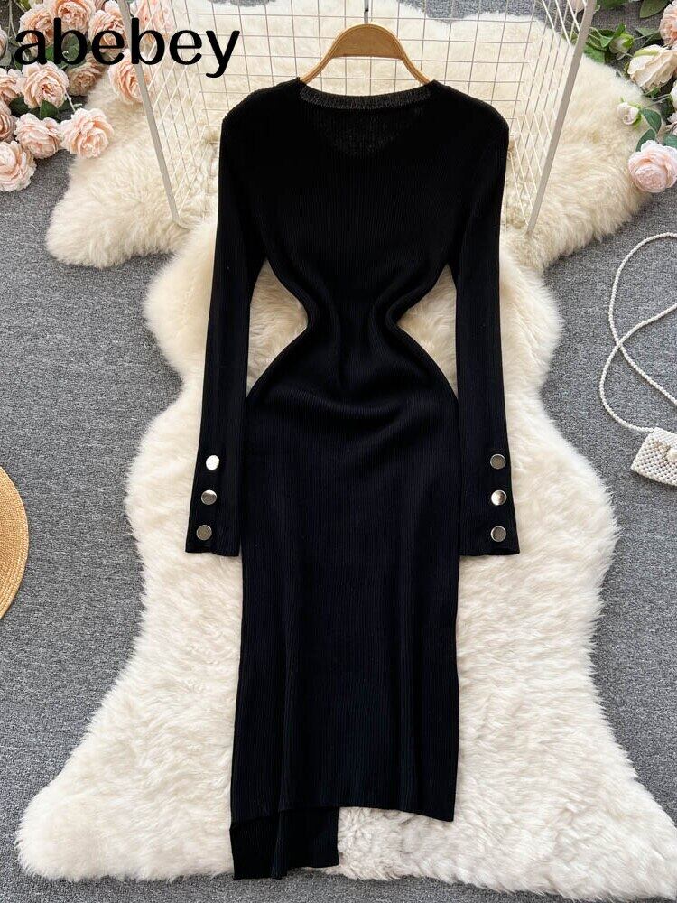 冬の不規則なニットドレス女性長袖シースセータードレススパンコールボタンボディコンミディロング暖かいドレス ウィンター 冬物 Abe2742310876