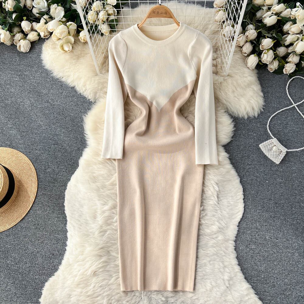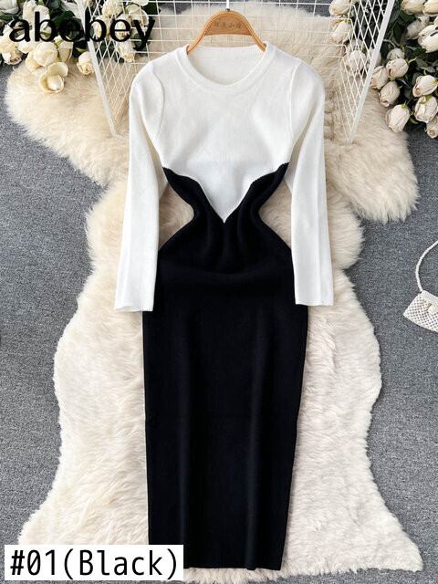 女性ニットロングドレス秋の長袖ミディウォームドレス 2022 フレンチスタイルのボディコンセータードレス オータム 秋物 Abe120810247