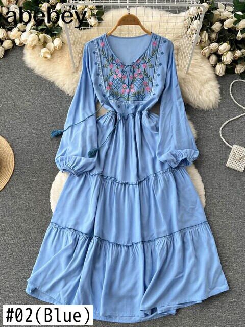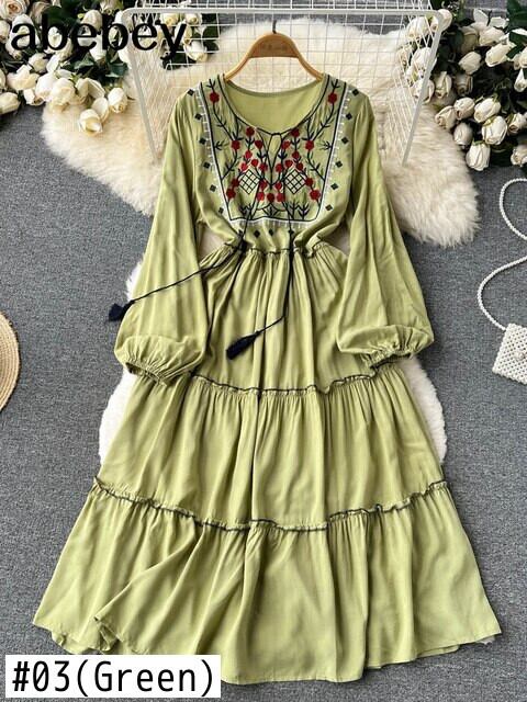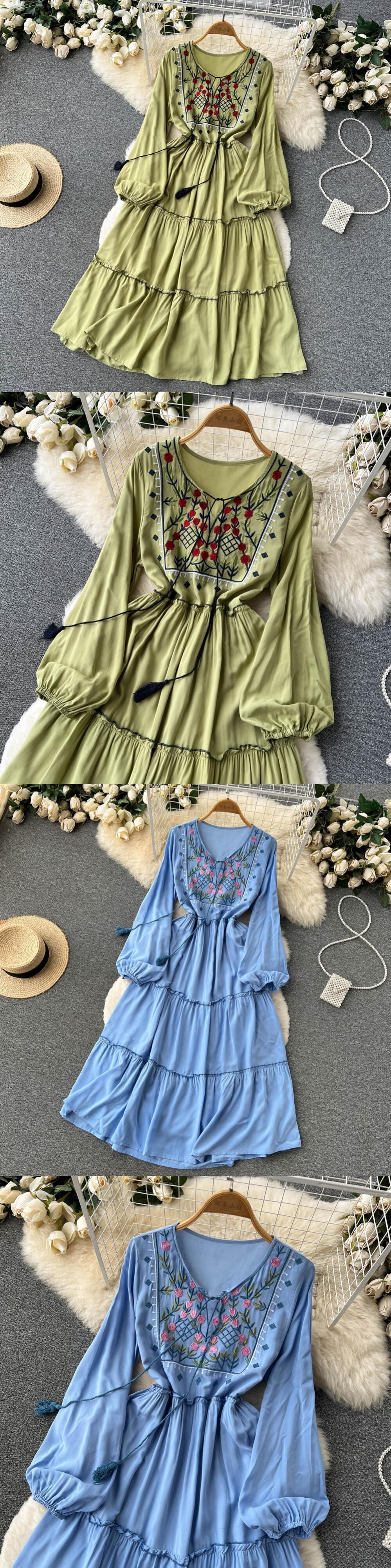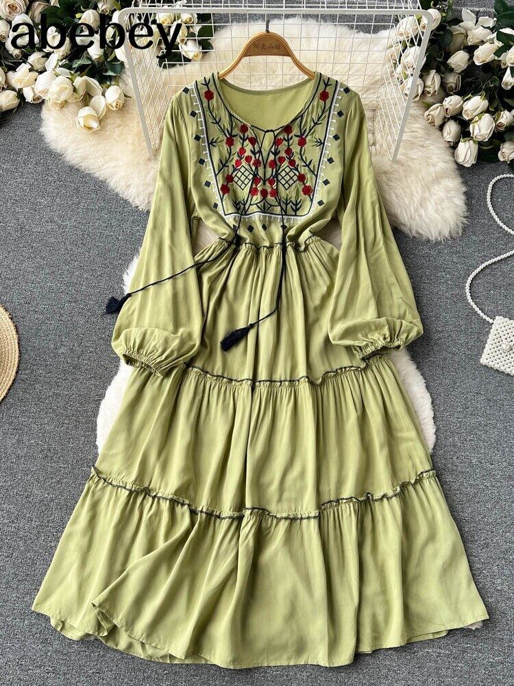 旅行休暇レトロなエスニック刺繍 Vestidos V ネック フリンジ レースアップ パフ スリーブ気質ミディ ドレス Vネック Abe6944264085