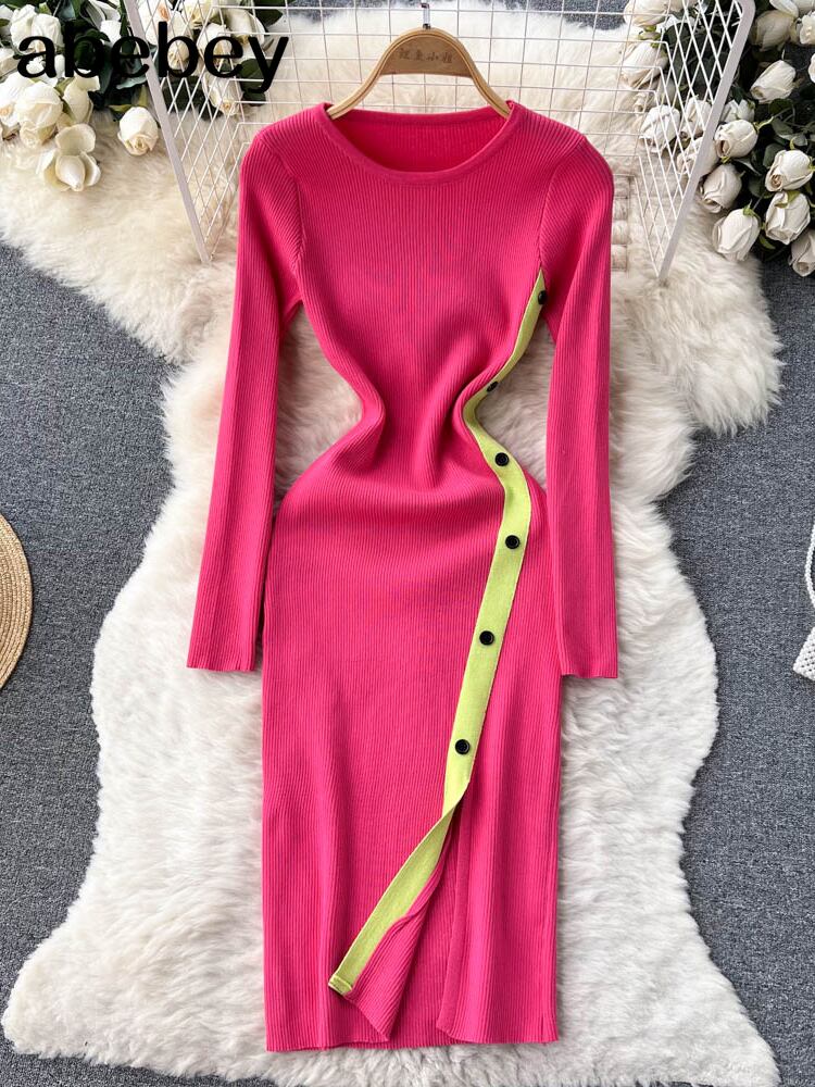 コントラスト女性ニットドレス長袖 O ネック弾性スリムペンシルドレス 2022 秋のセクシーなボディコンスプリットセータードレス ロング エラスティック 伸縮 オータム 秋物 Oネック Abe45115253965