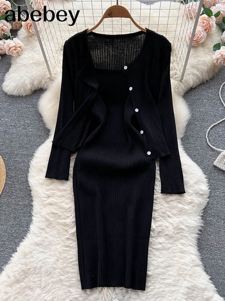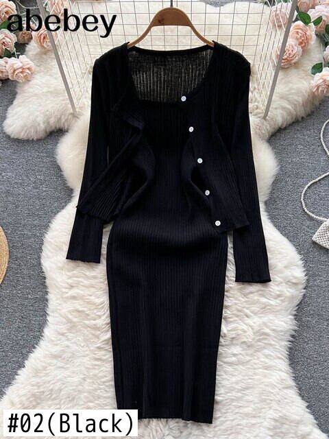 秋のプリンクニットツーピーススーツ女性長袖ニットカーディガン + スリムショートキャミドレスセータードレスセット 2022 ロング オータム 秋物 Abe28324160079