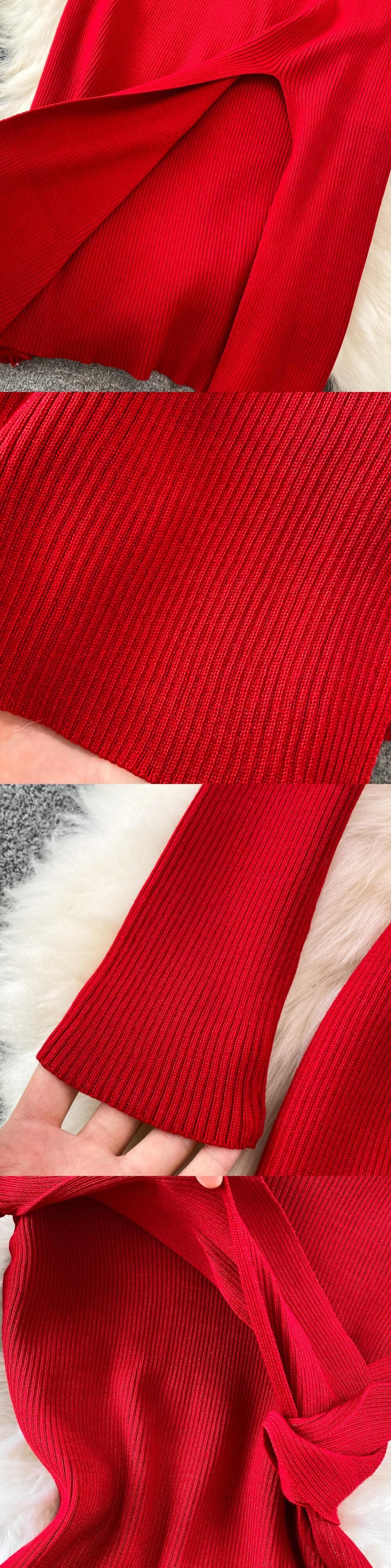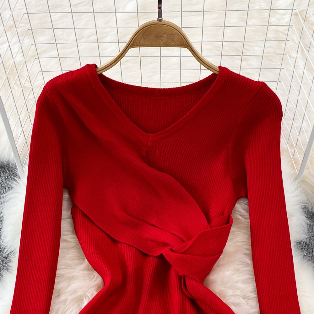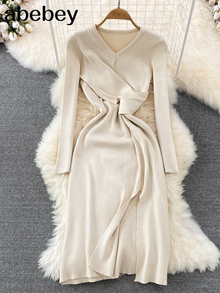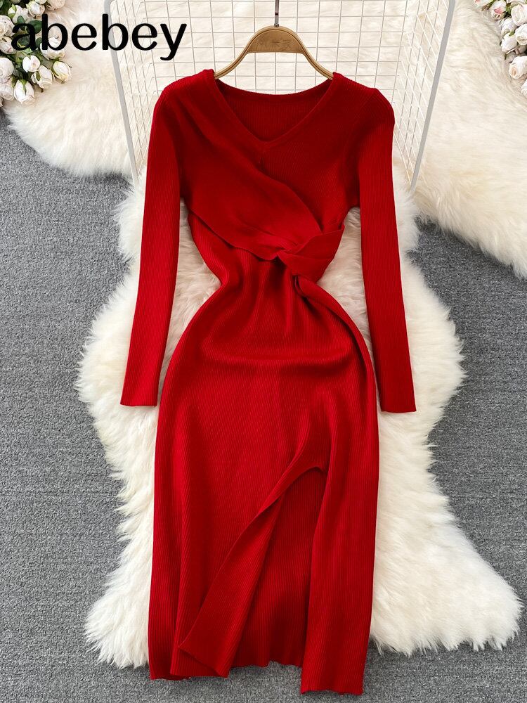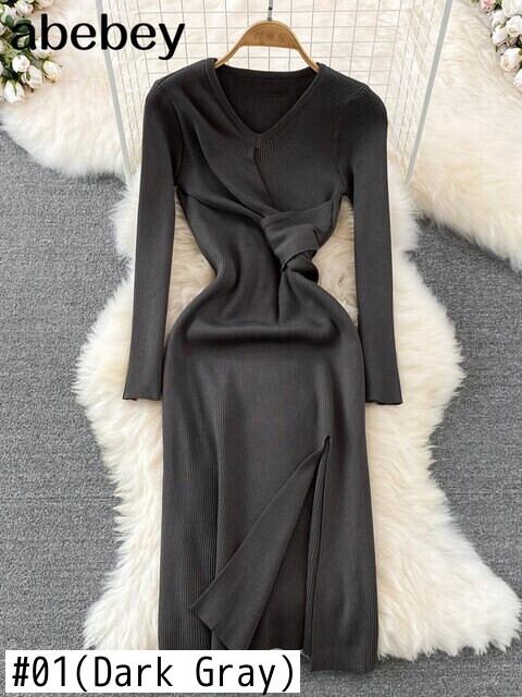 分割女性ニットペンシルドレス長袖 V ネック弾性スリムドレス秋冬セクシーなボディコン暖かいセータードレス ロング エラスティック 伸縮 オータム 秋物 ウィンター 冬物 Vネック Abe52936552279