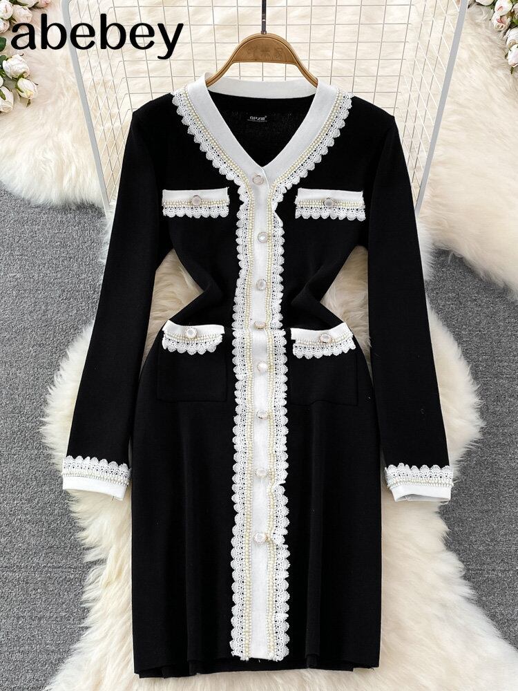 女性ニットドレス長袖 V ネック弾性スリムペンシルドレス 2022 秋のセクシーなボディコンボタンセータードレス ロング エラスティック 伸縮 オータム 秋物 Vネック Abe59669374427