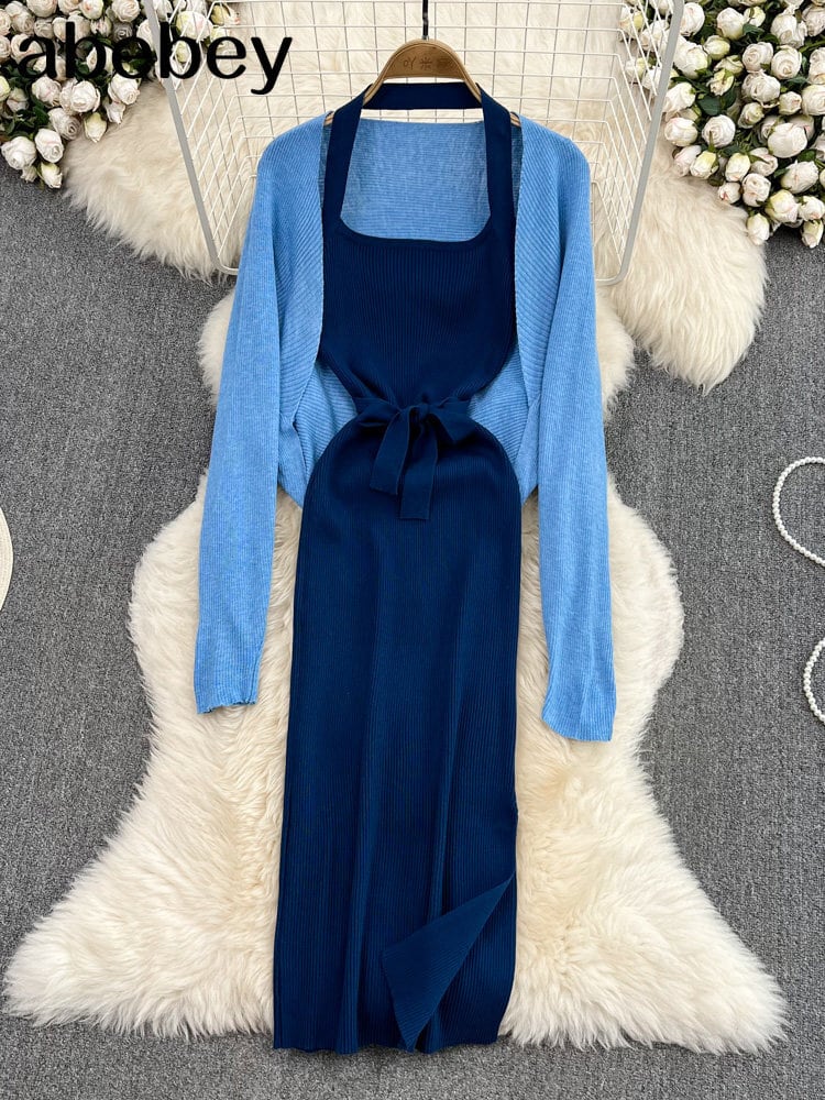 2022 ニット女性セットルーズロングスリーブカーディガン + 固体弾性ドレスフレンチスタイルのツーピースセット 長袖 エラスティック 伸縮 ソリッドカラー Abe61134130304