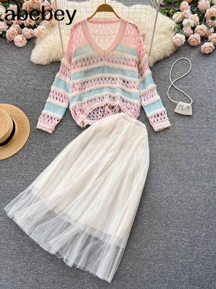 冬のツーピースセットボヘミアンバケーションビーチ 2 個セット女性長袖セーターとウエストプリーツメッシュロングスカートスーツ ウィンター 冬物 Abe24278801775