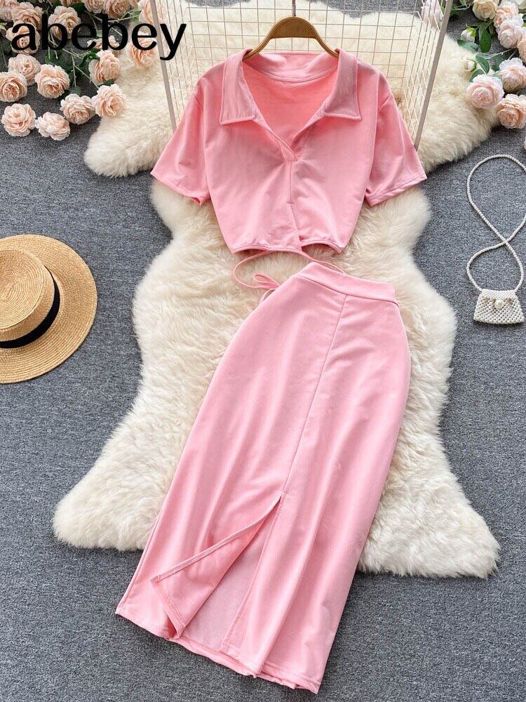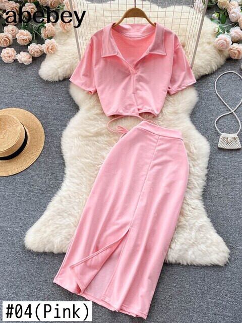 女性のセクシーなツーピースの服セット女性のスーツ無地半袖トップとウエストスプリットロングスリットスカート夏 outfis ショート ハーフスリーブ サマー 夏物 ソリッドカラー Abe50046401178