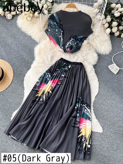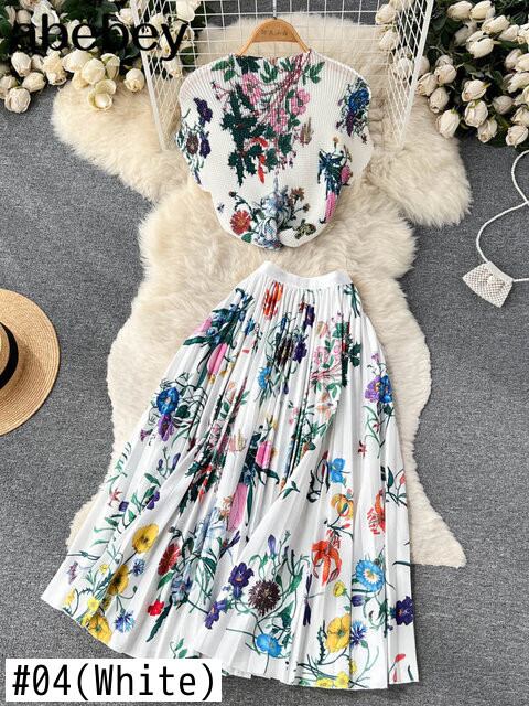 ボヘミアンバケーションビーチ 2 個セット女性花柄プリント半袖トップスとウエストプリーツロングスカートスーツ春夏 ショート ハーフスリーブ スプリング 春物 サマー 夏物 Abe5598669254