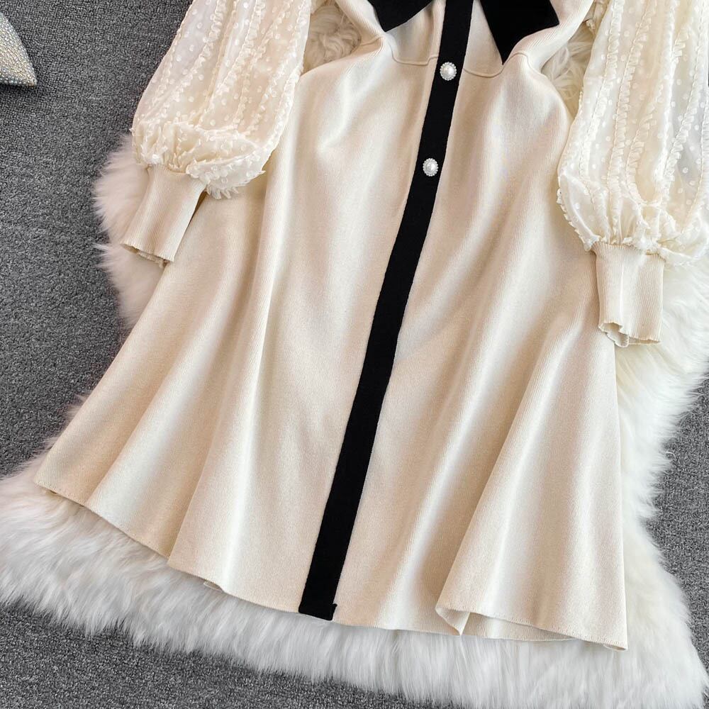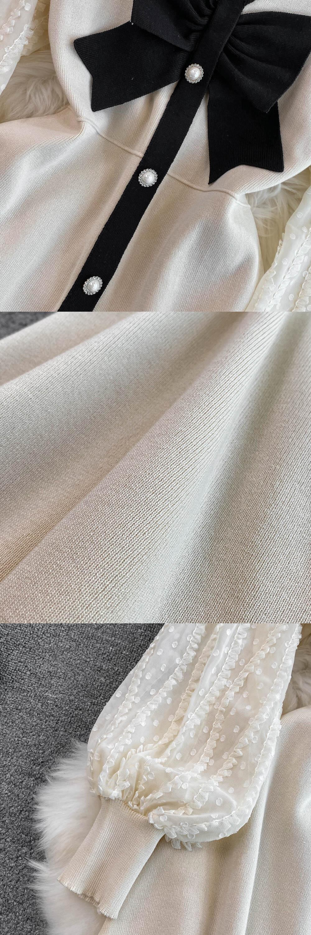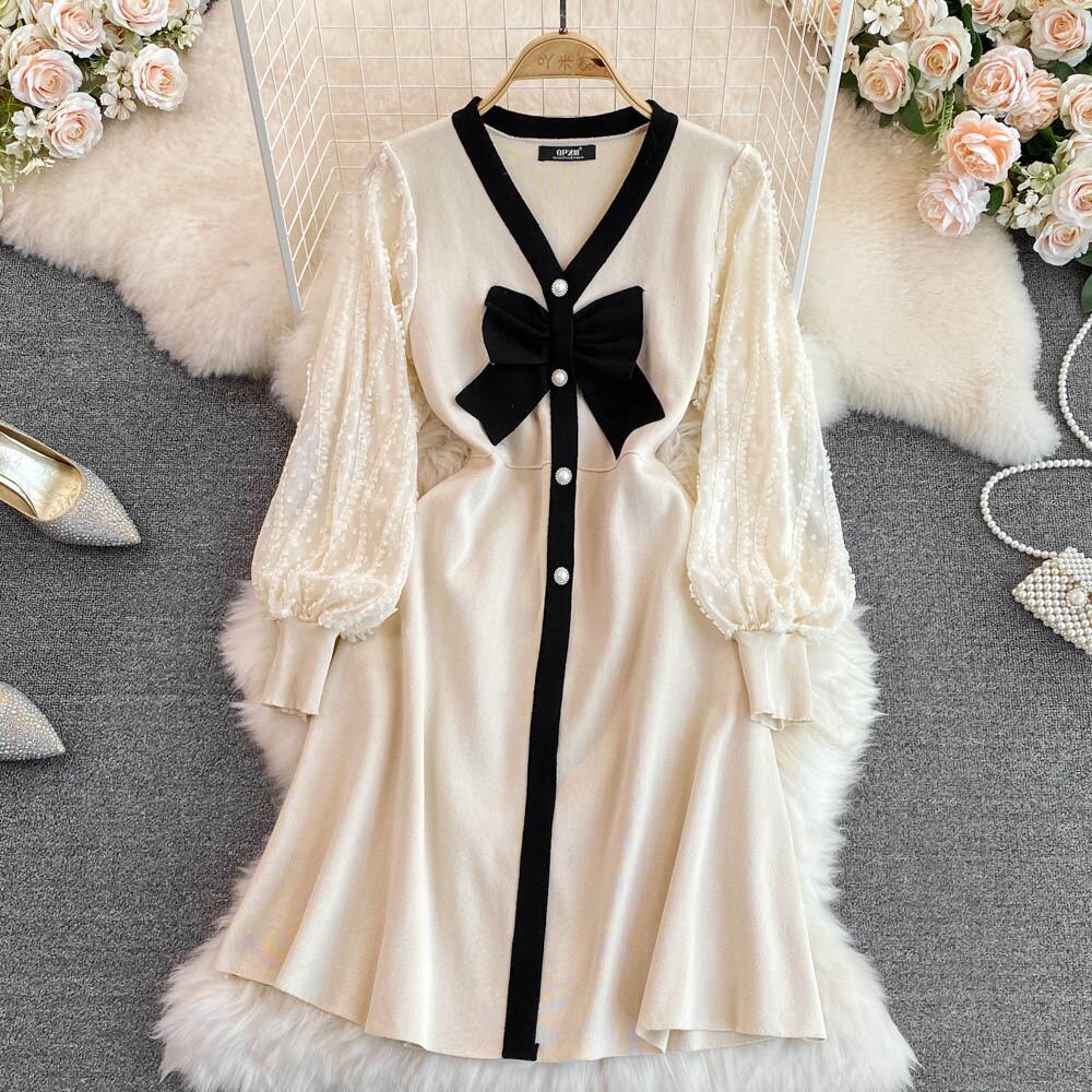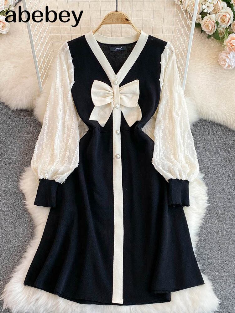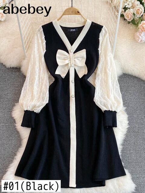 パットワーク レース ボウ セクシー ニット ドレス 長袖 スリム Vネック パーティー Aライン セーター ミディドレス ロング リボン Abe4573094955