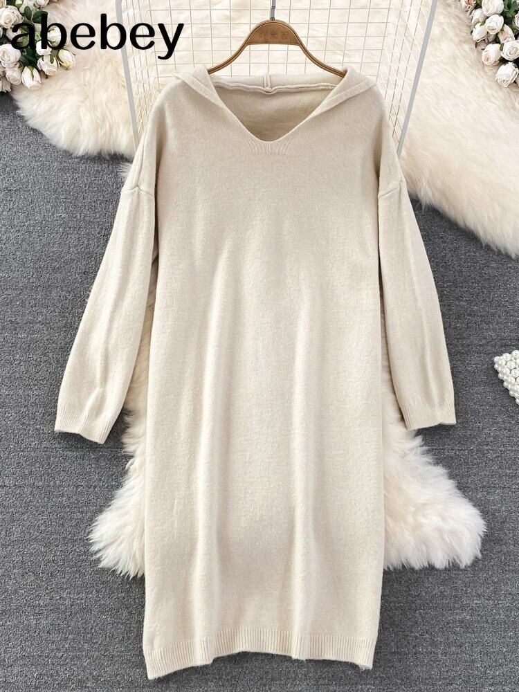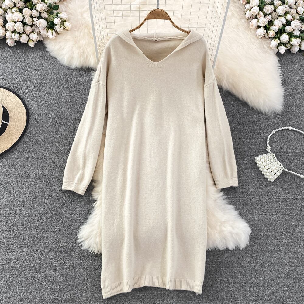 Vネックフード付き長袖セータードレス女性秋冬ルースチュニックニット服膝上ミニ無地ドレス ロング オータム 秋物 ウィンター 冬物 ソリッドカラー Abe99208317983