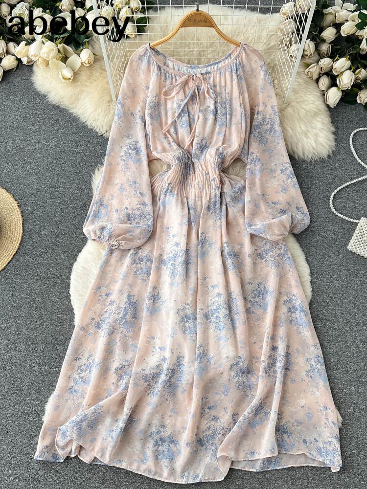 秋の女性プリントロングドレス O ネックランタンスリーブウエスト巾着マキシ Vestidos ローブ 2022 オータム 秋物 Oネック Abe47535638284