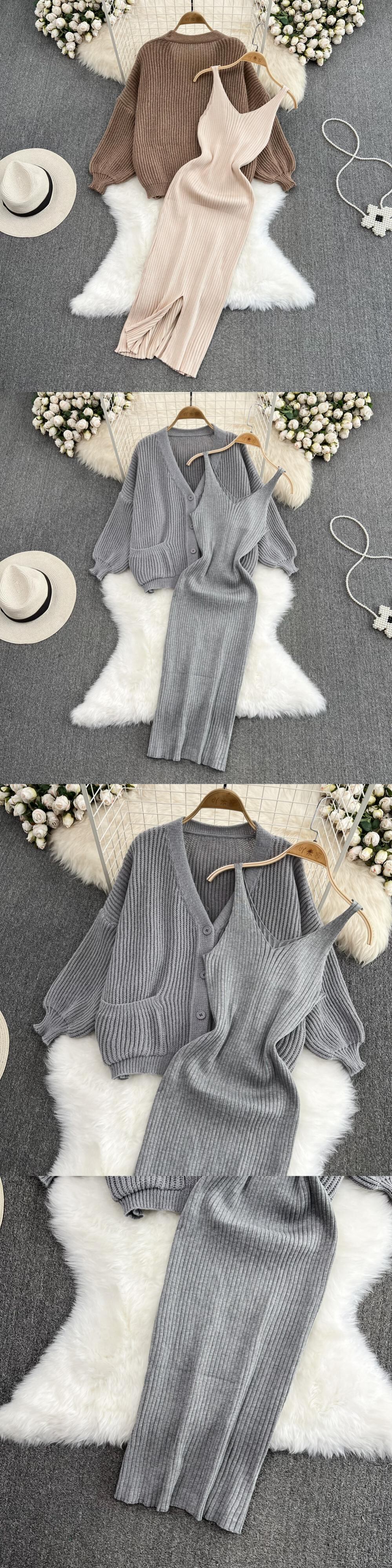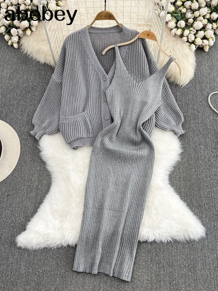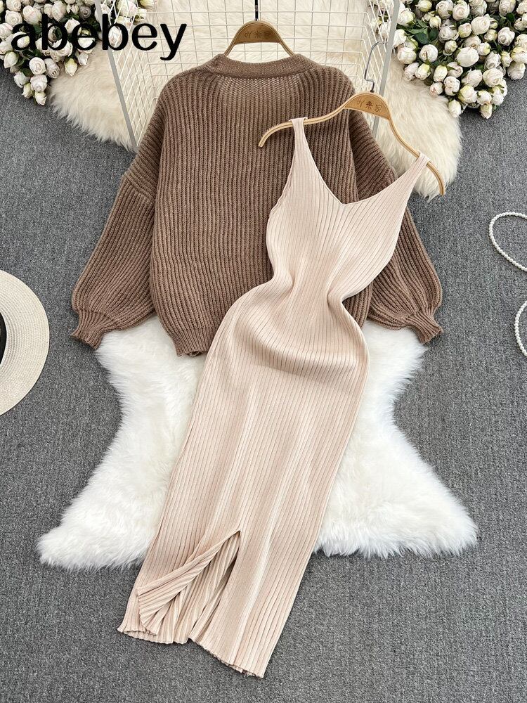 2022 ボタンニット女性セットルーズ長袖カーディガン + 固体弾性ドレスフレンチスタイルツーピースセット ロング エラスティック 伸縮 ソリッドカラー Abe88947253182