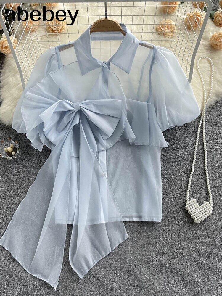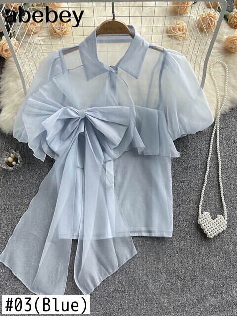 フリルトリムシャツレディースラペルランタンスリーブルーズソリッドボタンスルーブラウス ソリッドカラー Abe2540308460