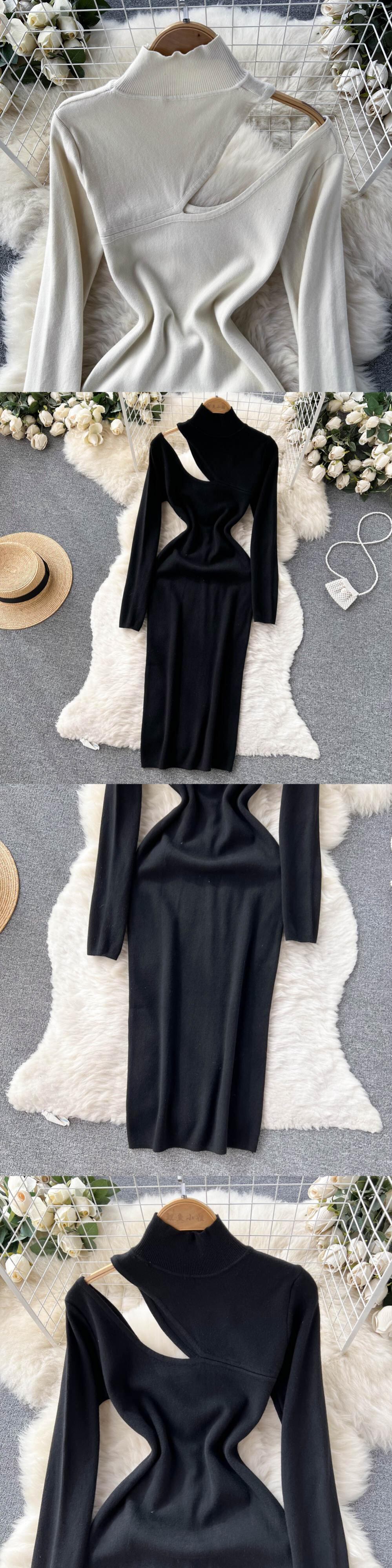 ブラック/ホワイト中空アウト女性ニットドレス長袖弾性スリムペンシルドレス 2022 秋のセクシーなボディコンセータードレス ロング エラスティック 伸縮 オータム 秋物 Abe21577571652
