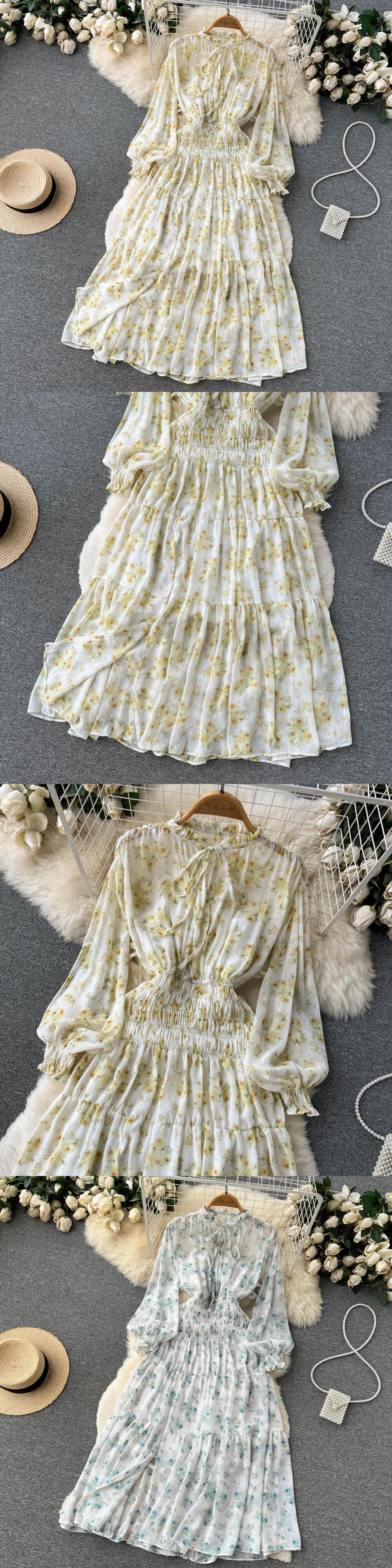 シニアシースプリントドレス気質ラフスリーブボタン秋弾性ウエストビーチ休暇花柄マキシロングドレス エラスティック 伸縮 オータム 秋物 Abe95353052528