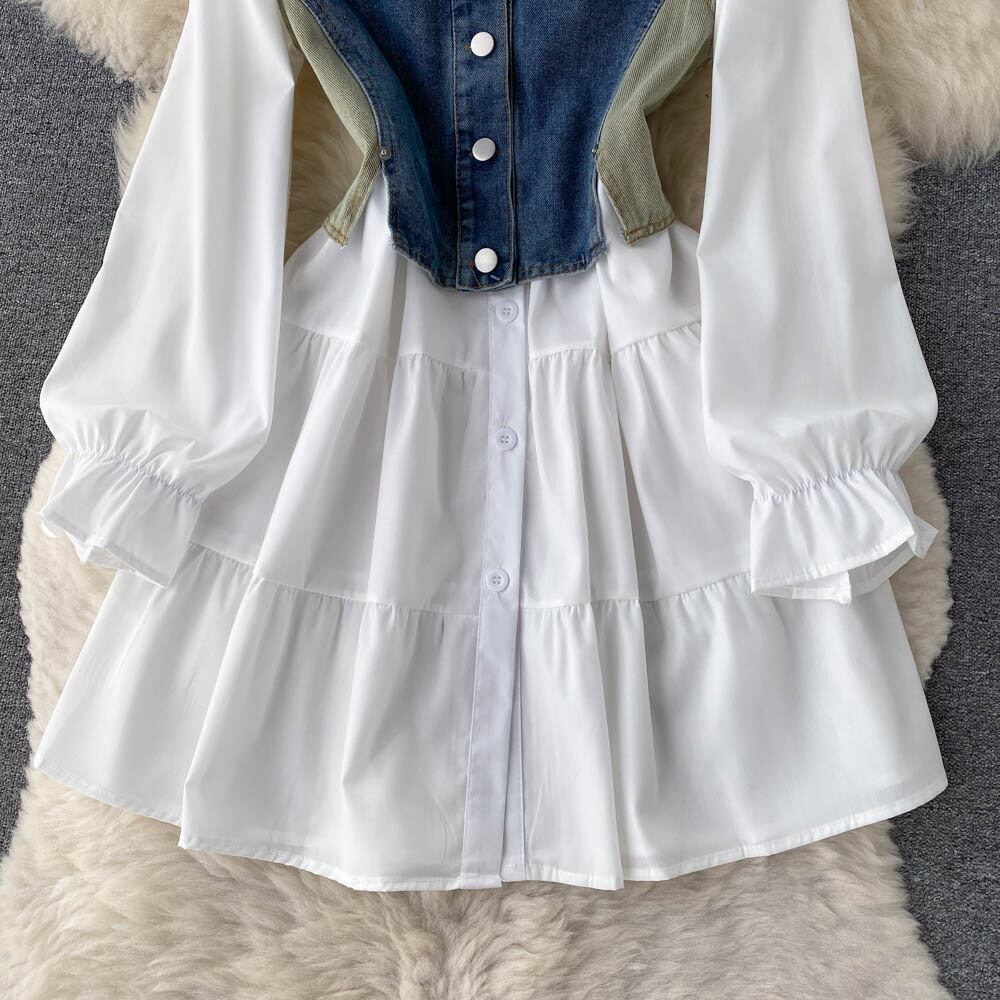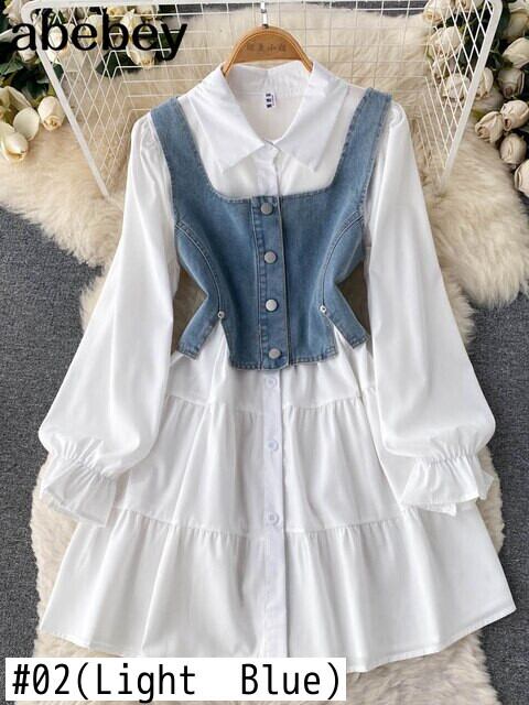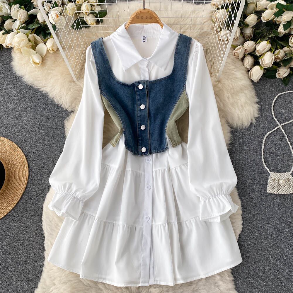 秋のドレス二枚スーツラフスリーブ白シャツドレス + ミニデニムキャミソールスーツ女性ストリートスリムセット ホワイト オータム 秋物 Abe52786392488