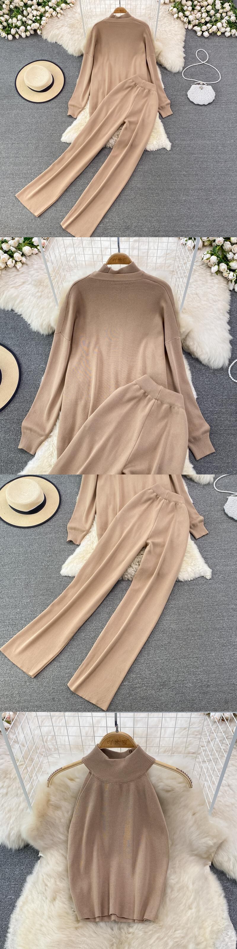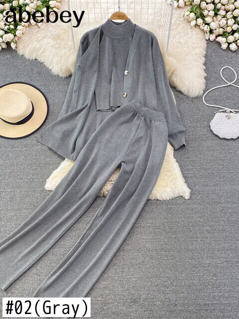 女性トラックスーツシックな 3 点セット ニット 無地ラウンジ スーツ カーディガン セーター + ジョガー パンツ + ノースリーブ タンクトップ ソリッドカラー Abe69148884156