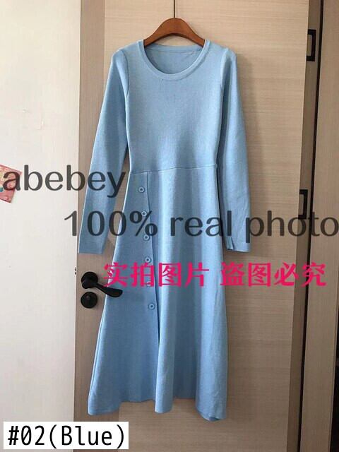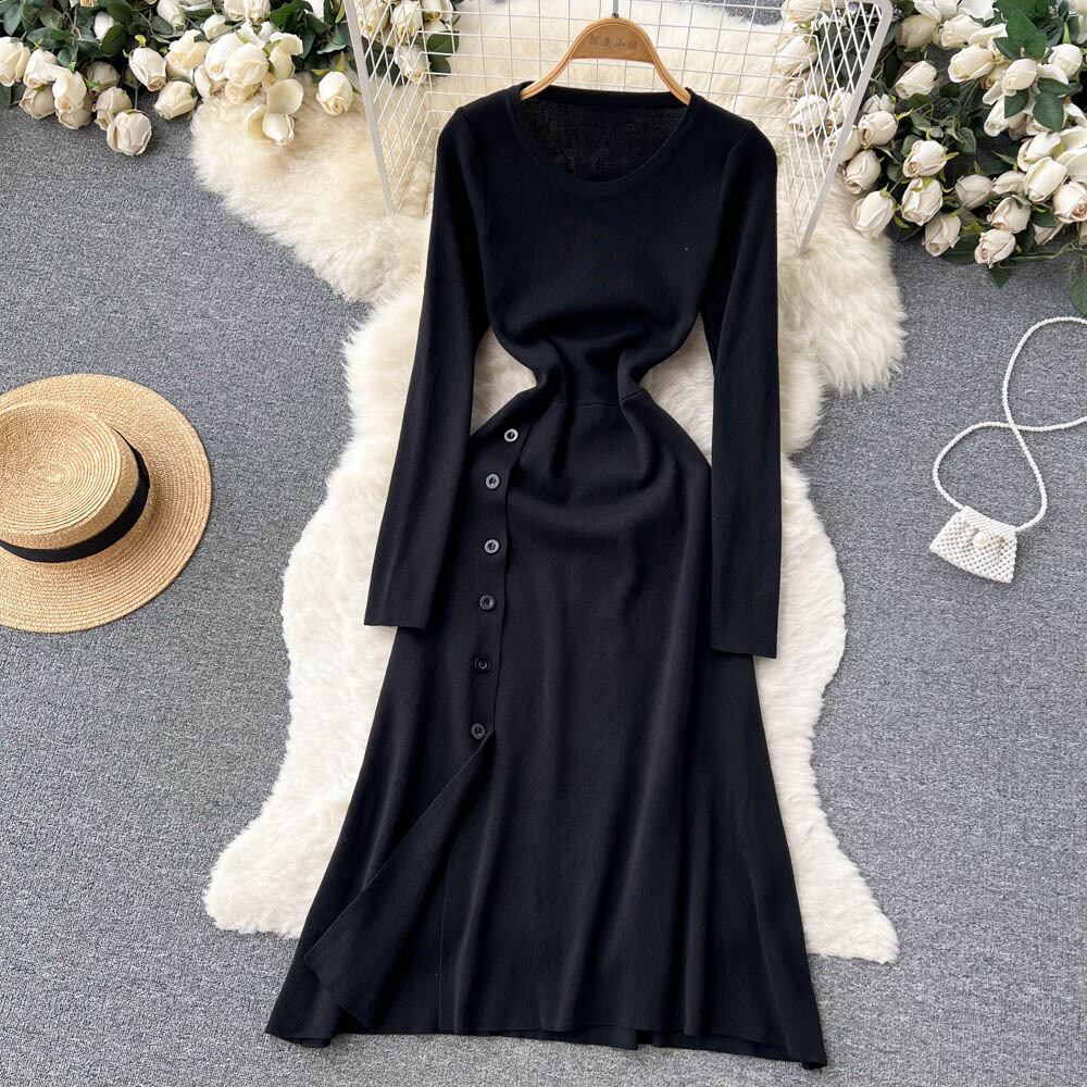 ニット スプリット ドレス レディース 春 ウエスト ボタン スリム ドレス 秋 ミッドカーフ ドレス スプリング 春物 オータム 秋物 Abe63180550622